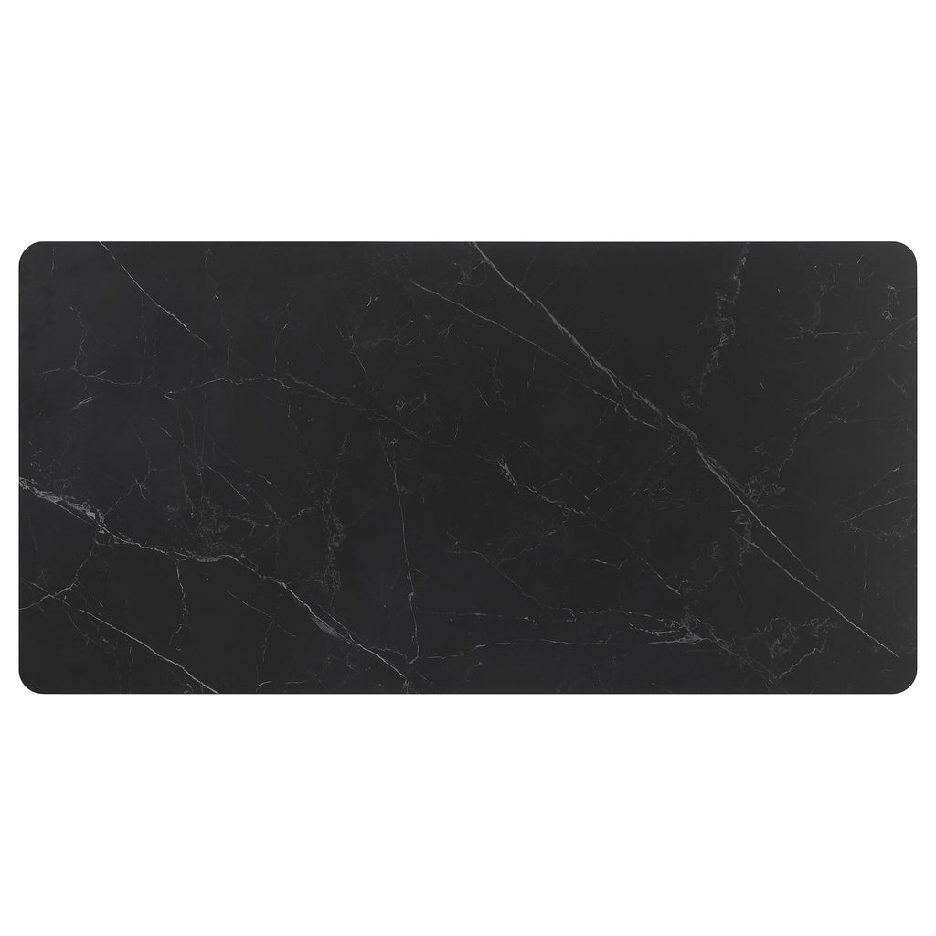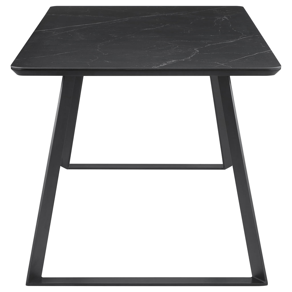 Elevate your dining experience with the stunning five-piece dining table set that seamlessly blends modern elegance with mid-century charm. The 71-inch dining table features a sleek black ceramic top with delicate white striations, creating a marble-like masterpiece perfect for any stylish home. Complementing this table are four upholstered side chairs, each wrapped in sophisticated grey fabric and supported by tapered gunmetal legs for a contemporary touch. This set promises to be the centerpiece of your dining room, offering both ample seating and unparalleled style. Transform everyday meals into extraordinary moments with this exquisite dining ensemble. Key Features: • Five-piece dining table set includes one dining table and four side chairs • Spacious rectangular 71-inch dining table with ceramic tabletop • Sled style metal legs with a matte gunmetal finish for a sleek contrast • Chairs feature grey textured fabric upholstery and tapered gunmetal legs • Mid-century modern design with contemporary elements for a timeless appeal