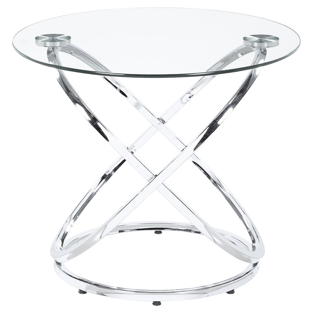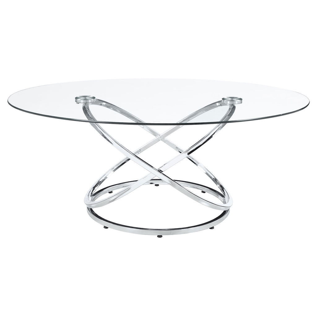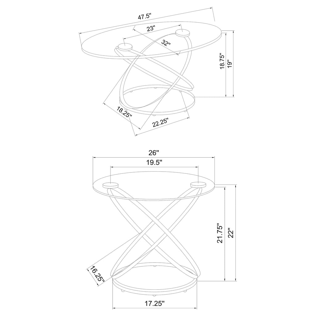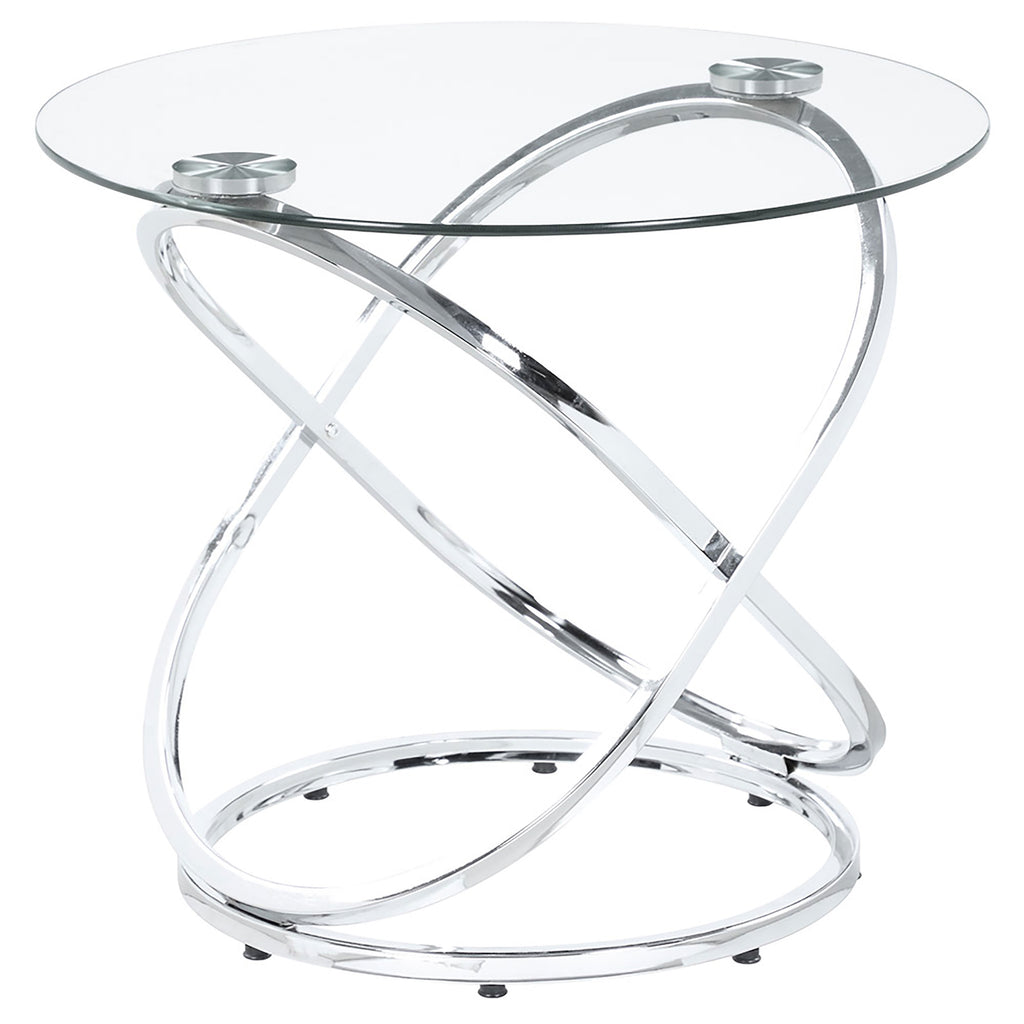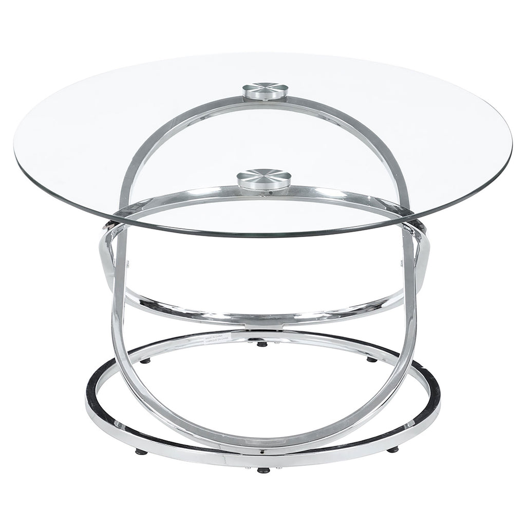 This striking coffee table set includes a cocktail table and two matching side tables, perfect for modern living spaces. Featuring clear tempered glass tops, these tables exude elegance and durability. The bases showcase polished chrome-finished metal in an intertwined ring design, adding a touch of contemporary flair. The open framework enhances visual lightness, making the set ideal for smaller spaces. Designed for style and functionality, this set is a versatile addition to any room. Key Features: • Modern coffee table set includes a cocktail table and two stylish matching side tables • Clear tempered glass tops combine elegance with enhanced strength and lasting durability • Intricate intertwined ring bases create an open and visually airy modern design • Polished electroplated chrome finish adds a sleek and sophisticated appeal • Heavy gauge metal construction ensures stability and reliable everyday use • Versatile design enhances style and functionality for contemporary living spaces