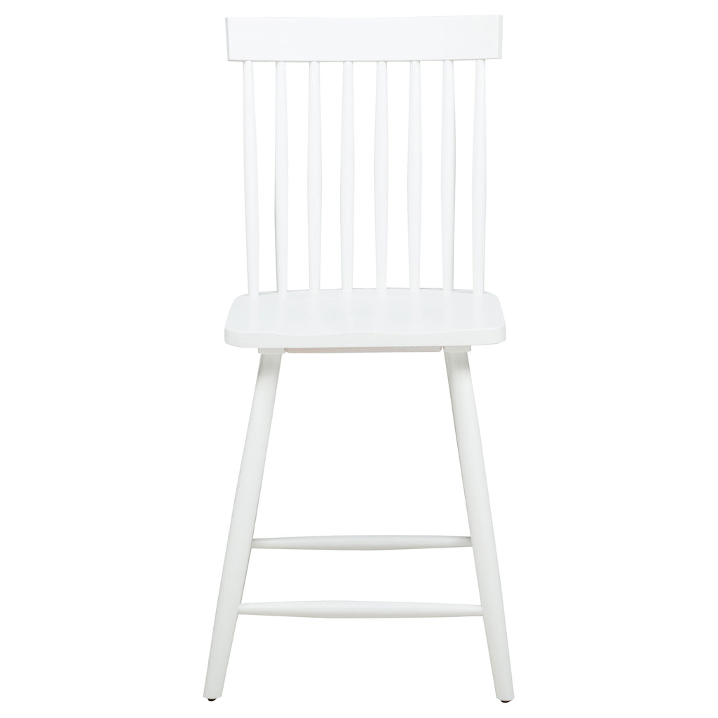 Elevated and inviting, this counter height dining set blends mid-century ease with farmhouse charm. A round table with tapered legs anchors the space, while Windsor-style chairs feature tall spindle backs and gently contoured seats for enduring comfort. Crafted from solid rubberwood with ash veneer over engineered wood, each piece highlights a soft natural grain. Perfect for kitchen nooks, breakfast counters, or casual dining spaces. Key Features: • Counter height dining set includes round table and chairs in a warm, light ash wood finish • Tabletop rests on tapered legs that offer mid-century styling with a compact footprint • Light ash Windsor-style chairs feature tall spindles and curved seats for relaxed elevated dining • Angled legs and stretchers on chairs provide support, strength, and balanced proportion • Crafted from solid rubberwood, ash veneer, and engineered wood for lasting performance • Light ash grain finish complements bar settings, kitchen islands, or elevated nooks