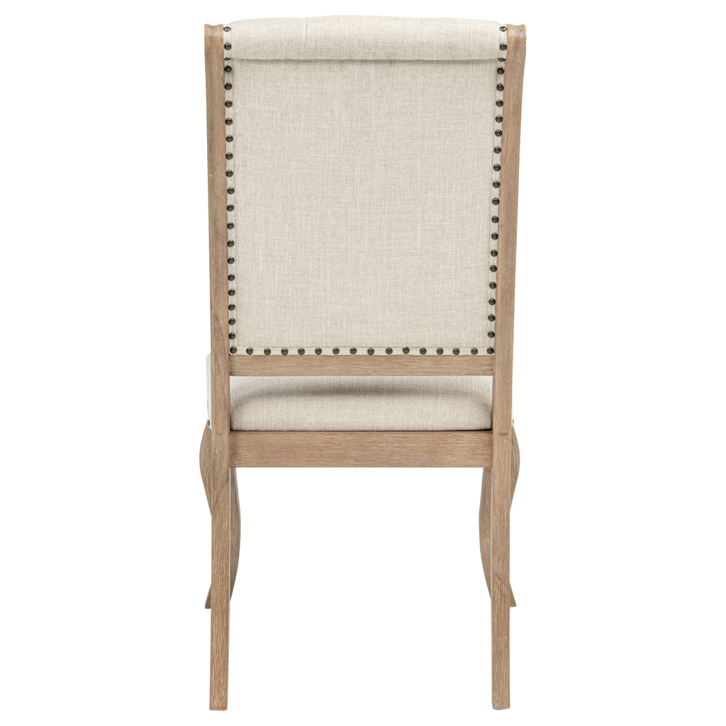 Nail head trim lends a refined presence to this tufted side chair. Ideal for a stylish dining room, this char features a plush, wide seat for optimal comfort. Its upholstered back is button tufted in a classic diamond motif, creating exceptional texture and depth. Cream-colored fabric ensures clean, neutral appeal to boost the style factor in any space. Crafted from Asian hardwoods, the chair is complete with a barley brown finish that's soft and inviting.