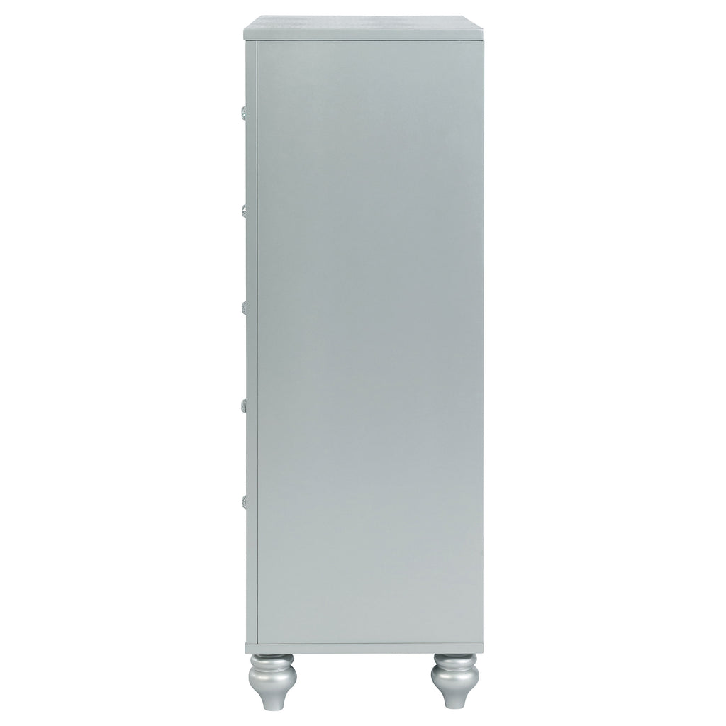 Enhance your home with a modern glam update to a classic design with this transitional five-drawer chest. It boasts a dazzling design that takes lends glitz to any modern bedroom. It comes in a vibrant silver metallic finish with fret work detail on the front panels and drawer fronts. The drawers are adorned with crystal-like pulls and the top ones are lined with black felt to protect treasured valuables. Delicate bun feet complete the design of this exquisite masterpiece. Key Features: • Five-drawer chest with vertical layout and glamorous silver finish • Mirrored trim frames each side and highlights the fretwork drawer fronts • Crystal-like drawer knobs add sparkle and coordinate with matching pieces • Top drawer includes felt lining for storing small valuables or accessories • Classic bun feet anchor the design with a soft traditional touch • Built from engineered wood, polyresin detailing, and mirrored veneer