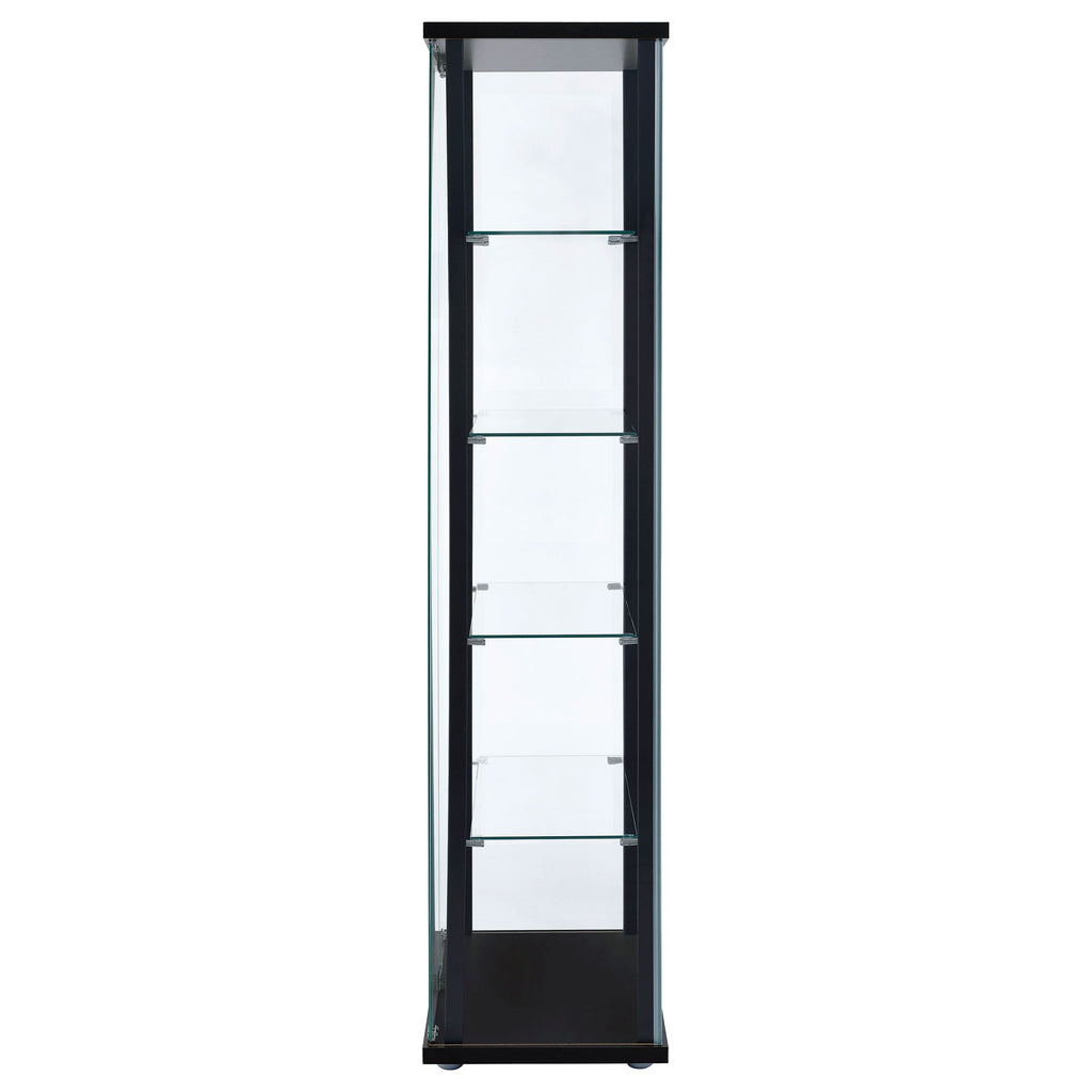 Transparency and linear styling make this curio cabinet stand out and shine. Simple design work blends straight lines with a slender black frame and tempered glass shelves. Push-to-open doors offer easy access to interior shelving. Put your best decor on display in this elegant piece that works beautifully in a living room or end wall. This enticing curio cabinet delivers a breathtaking look in modern and more traditional interiors. Key Features: • Black-finished frame with clear tempered glass for a sleek, modern style • Five tiers of open glass shelving for collectible or décor display • Push-to-open glass doors allow smooth and handle-free access • Sturdy construction with glass, engineered wood, and laminate accents • Ideal for use in living rooms, offices, or dining spaces • Includes chrome hardware accents and tip-over restraint