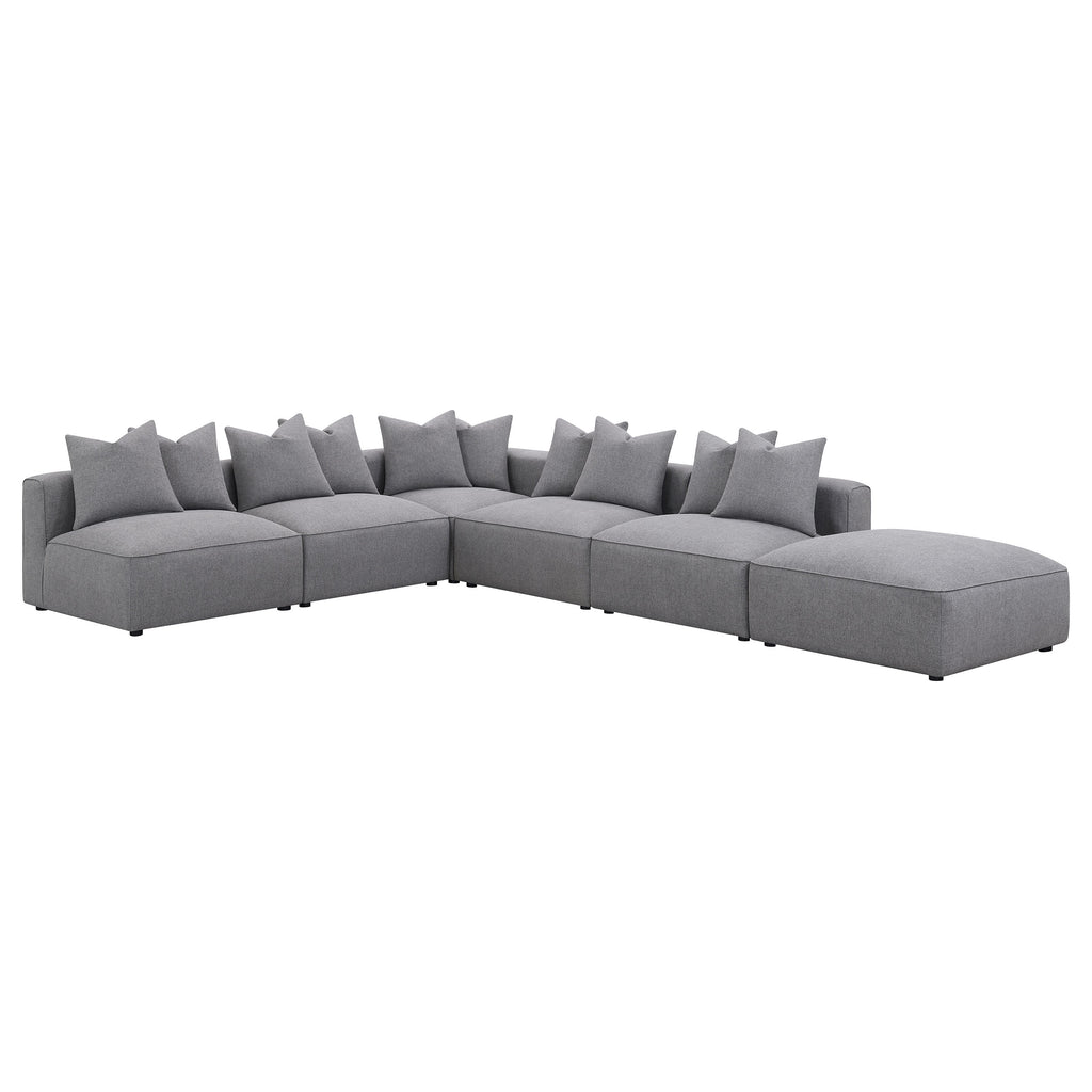 The minimalist design and sophisticated tailored look elevate this contemporary grey ottoman. The large, oversized, boxy shape is upholstered in a soft grey woven fabric that lends it a hint of texture. With a neutral monochromatic color palette, this ottoman slips into existing decor effortlessly. With a smooth, wide top, it welcomes a tray table of snacks and refreshments and doubles as a coffee table. Petite black legs beneath give it a slight lift off decorative rugs and flooring.