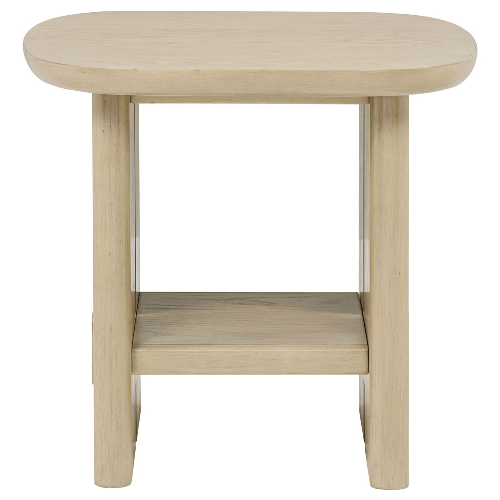 This end table captures California coastal modern living with a balance of authenticity and comfort. Its 1970s-inspired base design supports a softly rounded square top with a sculpted underside, creating a light yet substantial presence. Built from solid poplar, engineered wood, and oak veneer, it delivers both strength and natural warmth. A lower shelf provides additional space for books, décor, or daily essentials, making this side table a practical and stylish living room accent. Key Features: • End table with softly rounded square top and sculpted underside in beige oak veneer • Accent table base designed with 70’s inspired silhouette for bold coastal modern style • Solid poplar, engineered wood, and oak veneer construction ensures durability • Lower shelf provides convenient storage for books, décor, or daily essentials • Smooth rounded edges and sculpted details highlight careful craftsmanship • Occasional table side combines practical function with timeless California inspiration
