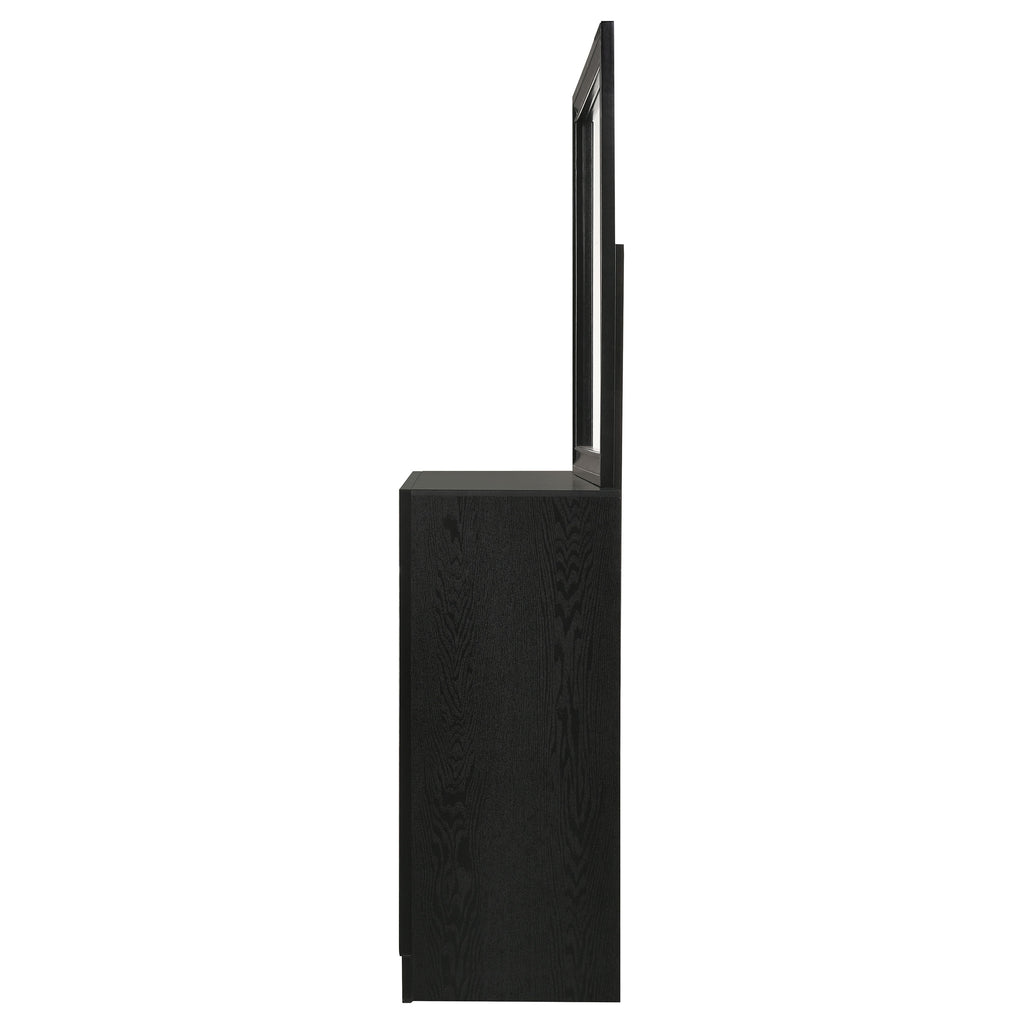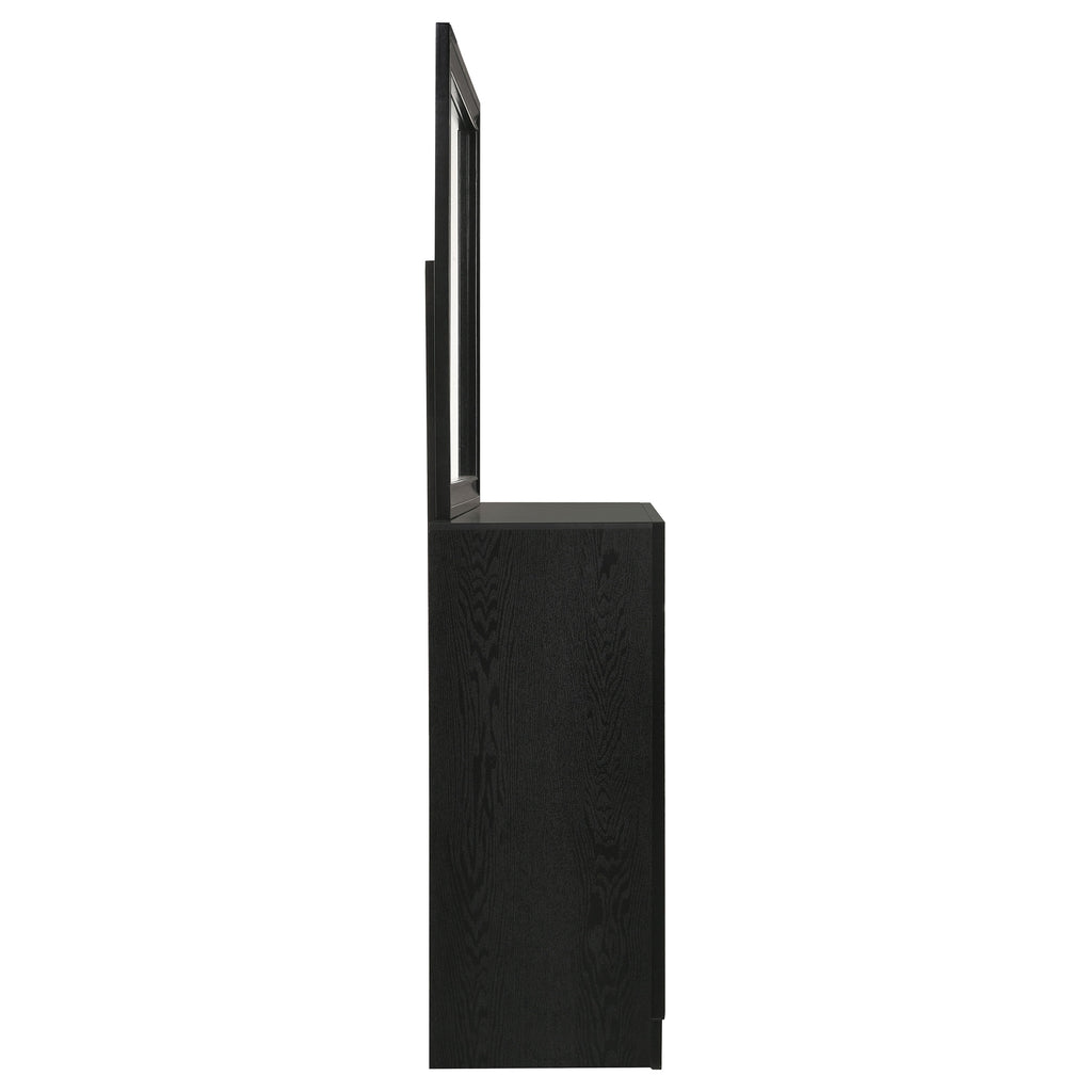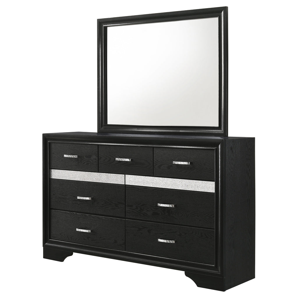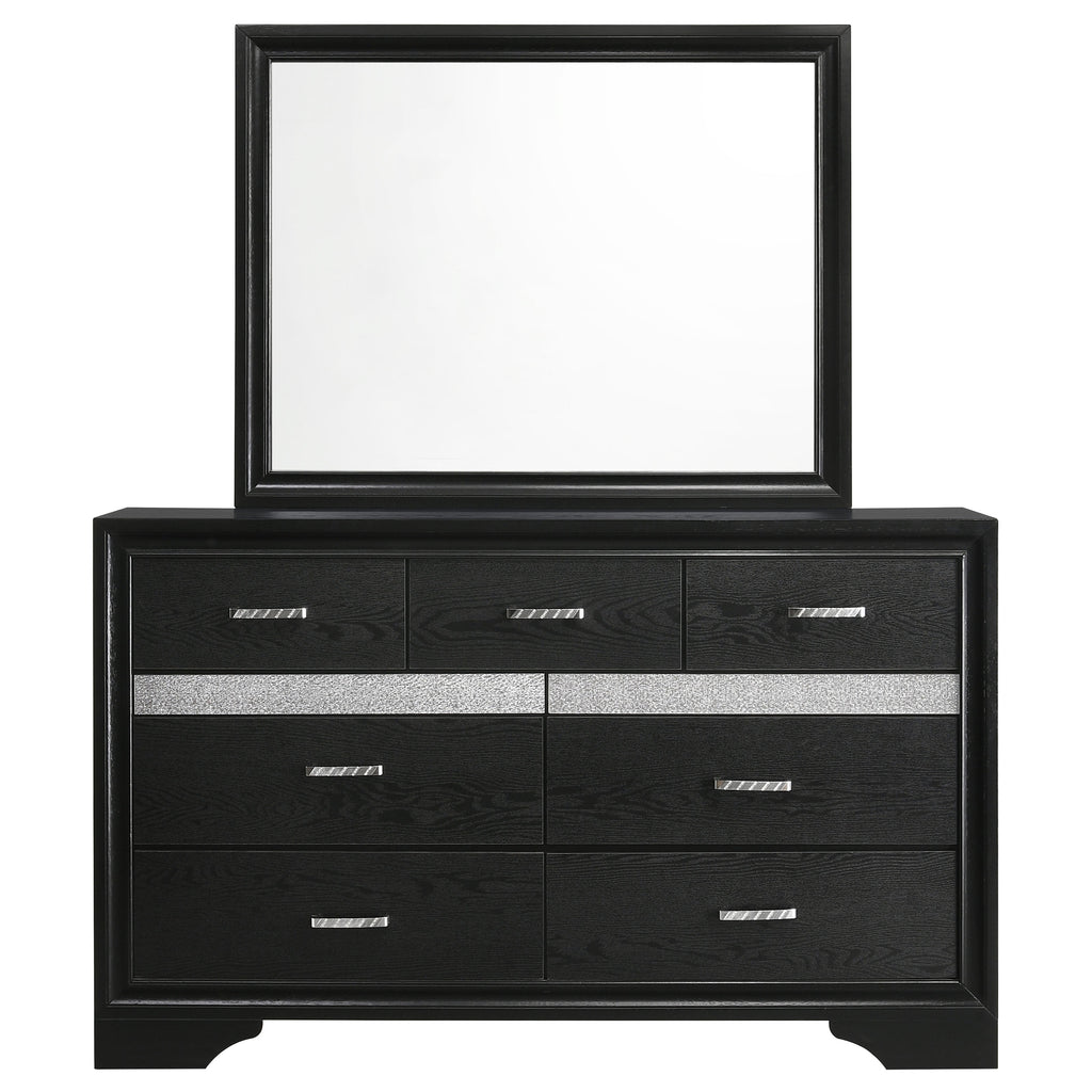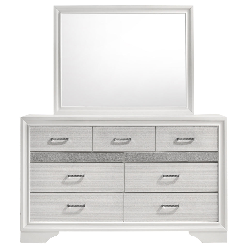 Bring sophisticated grace to your bedroom with this chic dresser, designed to lend an elegant touch to your personal sanctuary. Its felt-lined drawers offer safekeeping for delicate belongings, while the hidden jewelry drawer provides a discreet space for your treasures. The glittery panel across the front sparkles with opulence, enhancing the dresser's allure. Complementing the piece is the cheerful mirror, whose linear design and framed construction add a stylish ambiance. Choose from various finishes to perfectly round out your bedroom's design scheme. Key Features: • Seven-drawer dresser with smooth full-extension glides • Hidden jewelry drawer set behind glitter accent panel • Top drawers are felt-lined for delicate storage • Crystal drawer pulls add sparkle and contrast • Framed mirror with beveled edges complements the dresser • Constructed from engineered wood with white finish