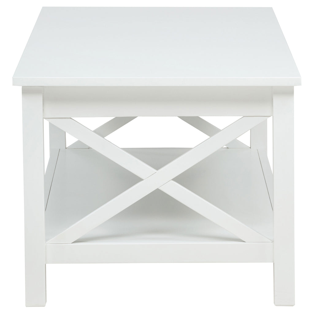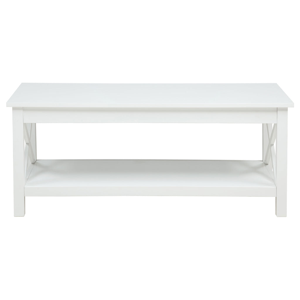 Designed for both movement and ease, this lift top coffee table blends farmhouse charm with modern function. A smooth, rectangular top rises to reveal hidden storage, supported by a sturdy cross-frame base and finished in classic white. Its lower shelf keeps essentials within reach, while the lift-top transforms the surface for casual meals or work-from-home convenience. Crafted from solid pine and engineered wood, it’s the perfect balance of charm and practicality. Key Features: • Lift top coffee table with X-frame sides for modern farmhouse appeal and support • White painted finish adds a clean, fresh look to casual or coastal living rooms • Lift-top design reveals hidden storage for remotes, books, or everyday items • Surface extends upward to 27-inch for flexible use as a writing desk or dining tray • Crafted from solid pine and engineered wood for durable structure and stability • Lower shelf offers open display space for baskets, décor, or magazines