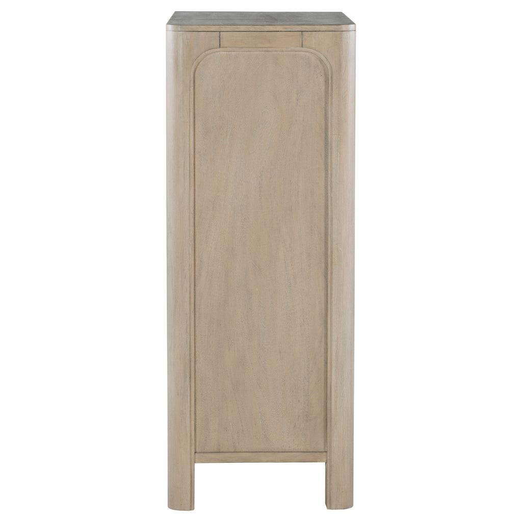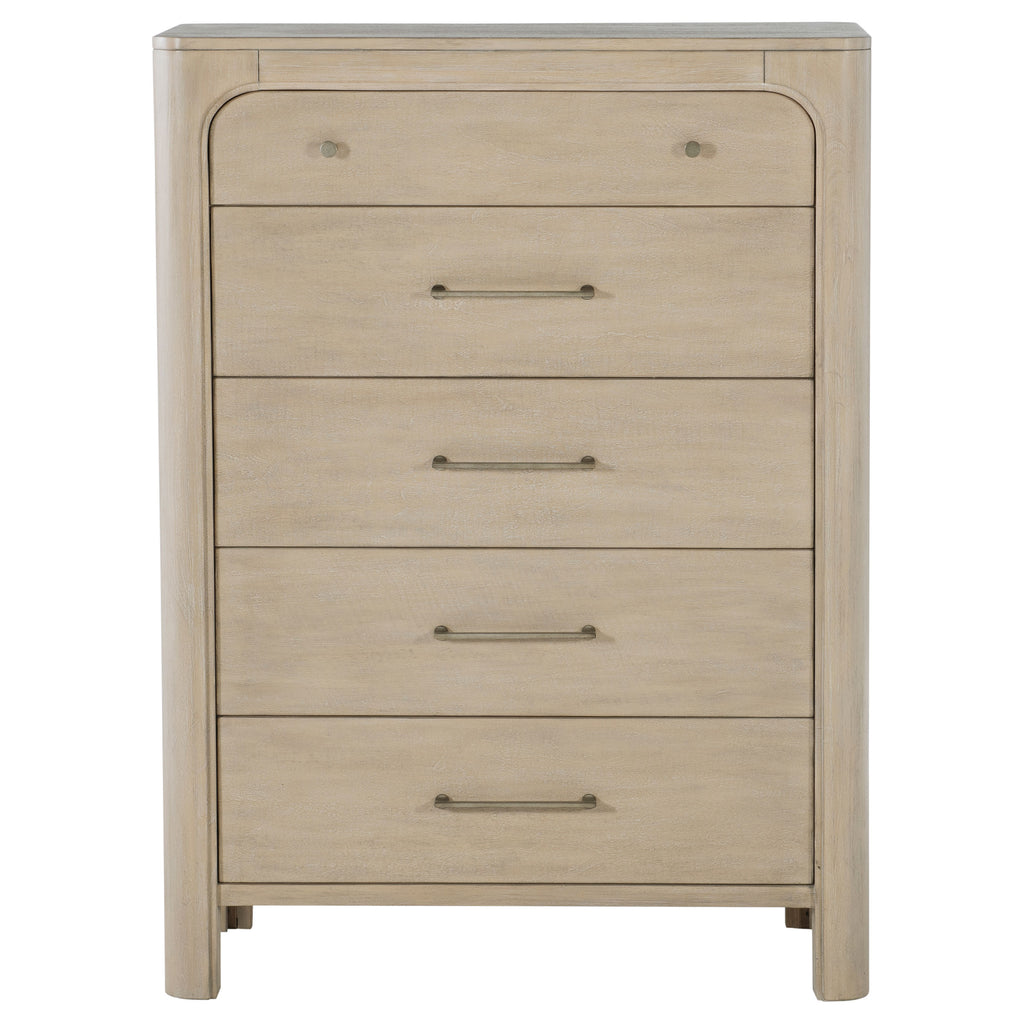 Gracefully composed with rounded edges and sculptural form, this five-drawer chest evokes a quiet sophistication. Its tall silhouette offers a sense of order, while sculpted corners and subtle detailing bring soft elegance to the bedroom. A felt-lined top drawer and hidden compartment add thoughtful layers of function. Crafted with care and presence, it offers both beauty and intrigue in equal measure. Key Features: • Five-drawer chest with sculpted corners and softened lines for elegant bedroom storage • Weathered mango finish enhances natural grain with a relaxed, organic texture • Felt-lined top drawer offers gentle protection for jewelry, watches, or accessories • Secret nested drawer in second drawer from top provides discreet storage • Heavy duty drawer glides ensure smooth, lasting drawer operation • Crafted from mahogany, engineered wood, and mango veneer for strength and style