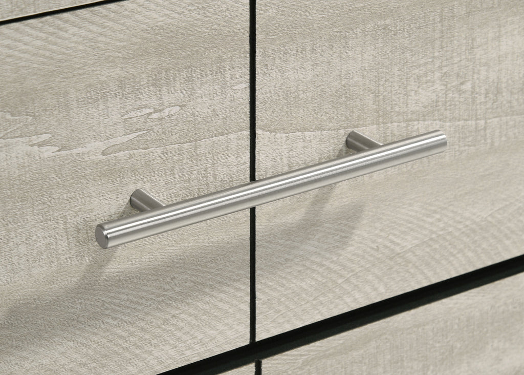 The dresser and mirror set combines sleek, contemporary lines with a touch of rustic charm, making it a standout addition to any bedroom. The dresser, finished in a rustic cream over rough-sawn, white-washed engineered paper veneer, offers six spacious drawers adorned with extra-wide polished nickel handles, adding a modern contrast. The mirror, with a clean-lined frame that complements the dresser, reflects light beautifully to enhance the room's brightness. Built from durable engineered wood with English dovetail joinery and Center metal glides, this set delivers both style and functionality. Key Features: • Dresser in rustic cream with rough-sawn, white-washed engineered paper veneer • Six spacious drawers with English dovetail joinery for added durability • Extra-wide polished nickel handles for a sleek, modern look • Mirror adds depth and light, enhancing the room’s visual appeal • Smooth Center metal drawer glides for easy access • Perfect combination of rustic charm and contemporary design