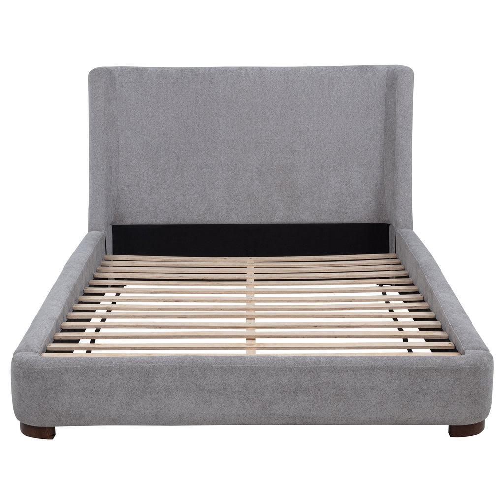 A study in soft curves and refined restraint, this upholstered platform bed brings sculptural poise to any bedroom. The wingback headboard wraps gently around the sleep space, offering both visual embrace and quiet shelter. Upholstered in textured grey fabric and supported by rich walnut-toned legs, it pairs warm contrast with tailored softness. Designed with built-in slats, this platform bed offers strong support without the need for a foundation. Key Features: • Queen platform bed with sculpted wingback headboard and modern silhouette • Grey fabric upholstery offers soft texture and tailored visual warmth • Built-in slat system supports mattress without a box spring or foundation • Curved headboard design provides quiet structure and architectural softness • Walnut-tone legs add contrast and grounded beauty to the base • Crafted from fabric, foam, plywood, and rubberwood for lasting quality