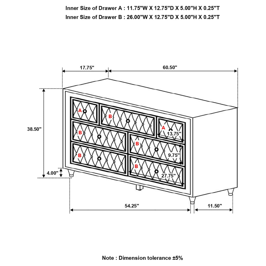 Makeover your bedroom with this upholstered dresser. Bursting with French Provincial style, it's the perfect blend of traditional and modern. Seven spacious dressers are equipped for storing garments and clothing. Each dresser drawer is upholstered with soft fabric and button tufting. Crystal-like accents serve as buttons and drawer knobs and this piece is supported on tapered legs, injecting incredible style in your space. Key Features: • Seven-drawer dresser upholstered in soft ivory velvet for a glamorous profile • Drawer faces are button-tufted with faux crystal accents for added sparkle • Champagne-finished tapered legs lend height and visual softness • Crystal drawer knobs coordinate with mirror and nightstand detailing • Top drawers are perfect for organizing accessories or fine garments • Engineered wood frame with padded velvet overlay and decorative hardware