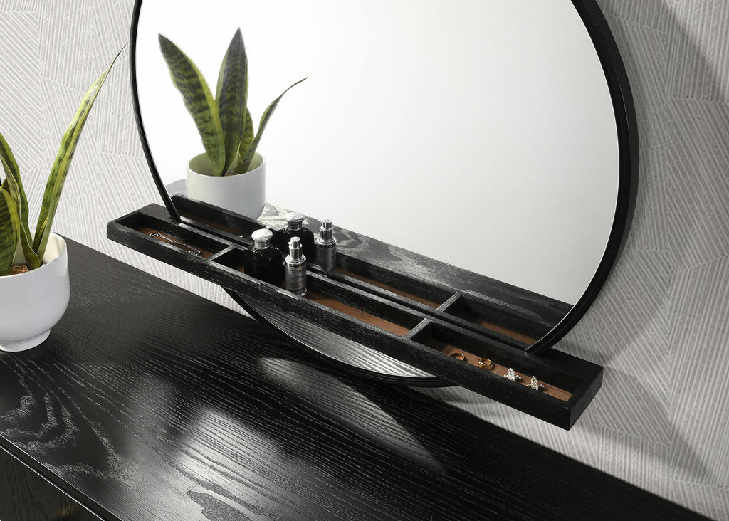 Hint of soft, muted gold instantly elevate the look and feel of a five-piece modern bedroom set. It centers on chic bed with a contemporary open profile and woven rattan head and footboards in a natural hue, Black finish framing and muted gold legs complete the look of the bed, while offering a fresh, almost glamorous look for the nightstand, chest, and dresser. An eight-drawer dresser includes a mirror with an ingenious jewelry tray built across the front of round glass. The nightstand adds three bedside drawers while the chest provides another five for easy clothing, linen, and accessory storage to create a tidy, stylish bedroom ensemble. Ball knobs complete each drawer front and top drawers include felt lining that provides protection for electronics and other delicate items.