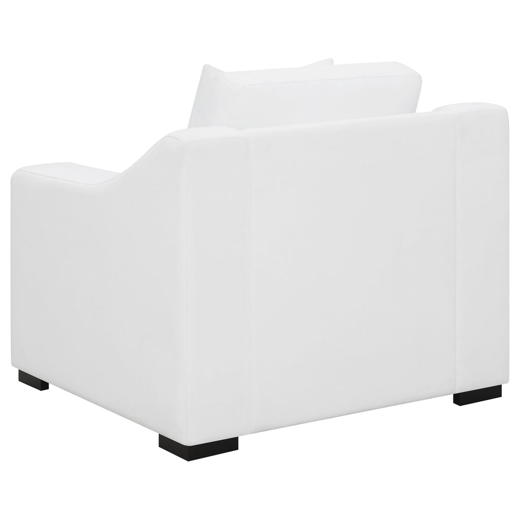 Elevate your transitional living room with this contemporary upholstered seating set, featuring a white trillium polyester blend fabric that covers elegant sloped track armrests as well as reversible box seat and back cushions with top stitching details. Block style legs in a handsome, bold cappuccino finish lend a striking contrast to the clean white upholstery. Matching accent pillows offer extra comfort and unify the seating pieces together.