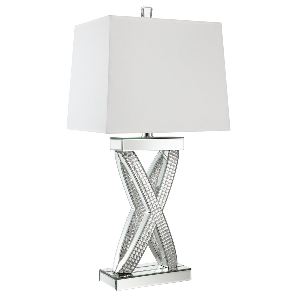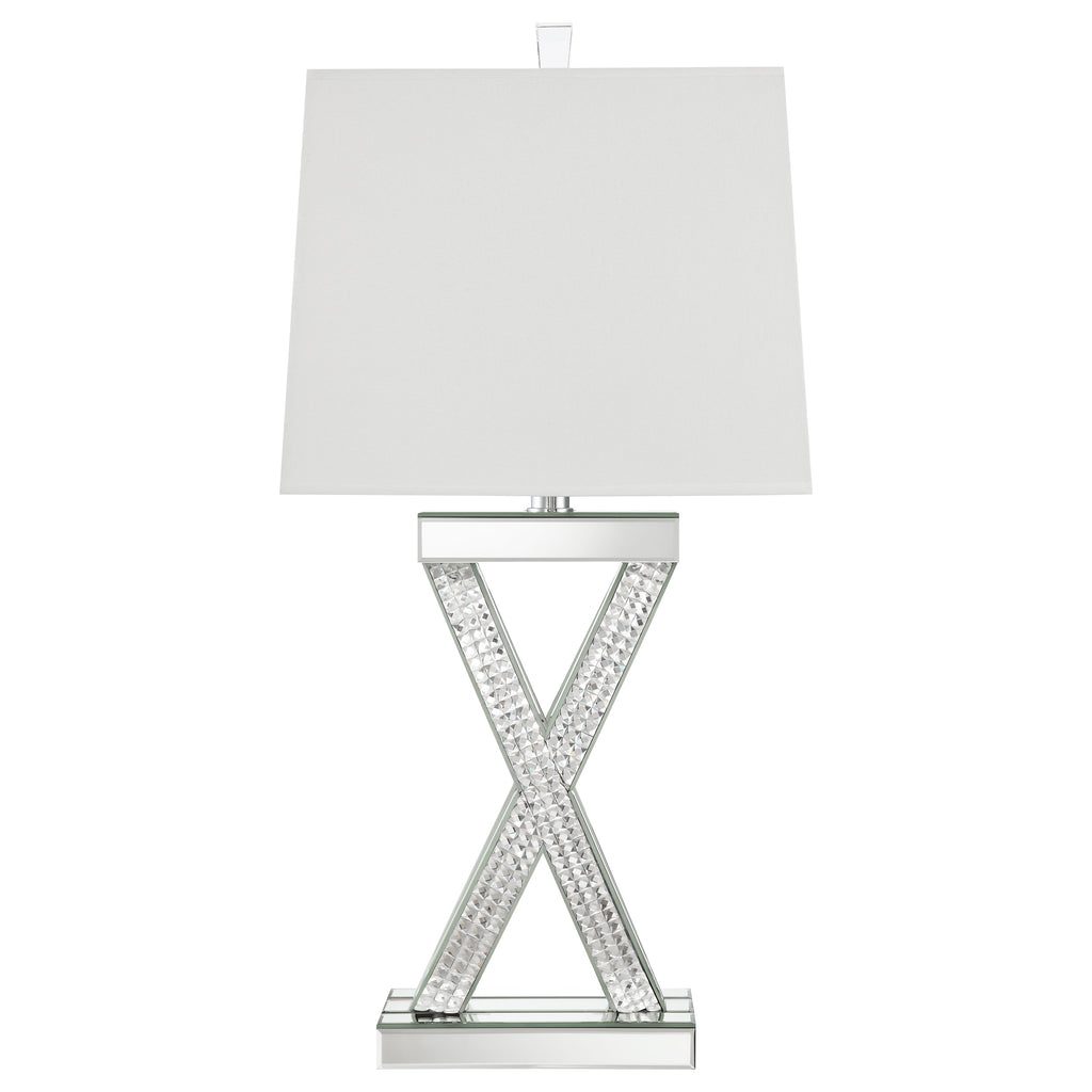 This table lamp features a sculptural X-shaped base accented with shimmering mirrored panels and faceted acrylic crystal inlays. Its bold silhouette and reflective finish create a dramatic presence, while a rectangular white shade provides soft ambient light. Designed to stand out in any glam-inspired space, the lamp fuses artistic form with modern shine—perfect for entryways, bedrooms, or living room consoles seeking a touch of sparkle and geometric sophistication. Key Features: • Table lamp with sculptural X-frame and glamorous mirrored base design • Faceted acrylic crystal inlay adds shimmering visual texture and depth • Rectangular white shade delivers clean lines and diffused light • Mirrored finish reflects surrounding elements to enhance brightness • Striking silhouette works well in glam and contemporary interiors • Ideal for bedside, console, or living room table placement