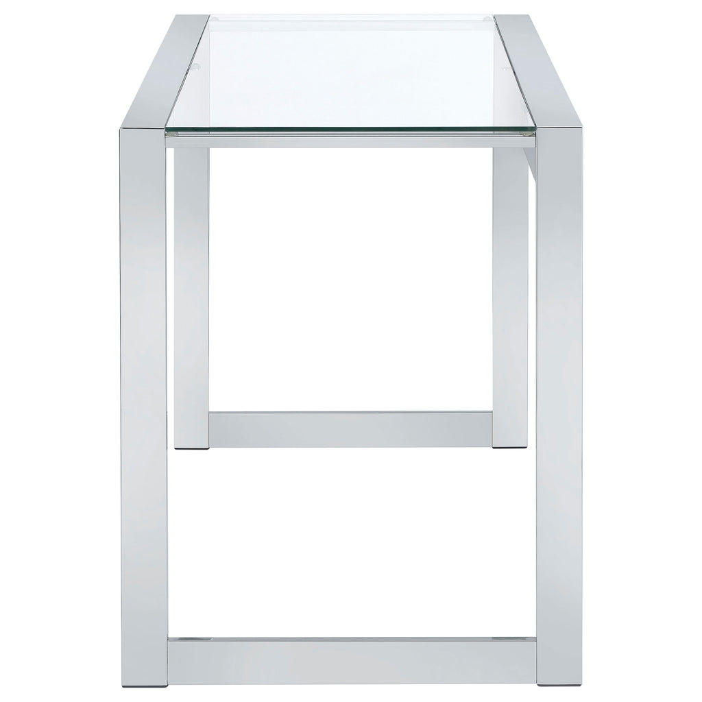Achieve a sleek and modern workspace with this glass writing desk, perfect for home or commercial office settings. The spacious clear tempered glass top offers a minimalist aesthetic while providing ample room for work, design, or brainstorming sessions. Supported by a sturdy chrome metal frame, this desk ensures stability and durability while enhancing contemporary interiors. Whether used for professional tasks or creative projects, this stylish desk brings both form and function to any workspace. Key Features: • Modern writing desk with a sleek chrome-finished frame • Clear tempered glass tabletop creates a spacious, airy look • Durable metal and glass construction ensures long-lasting stability • Minimalist design complements contemporary, home, or commercial offices • Generous workspace ideal for writing, designing, or working on a laptop • Perfect addition to modern workspaces, studios, or study areas