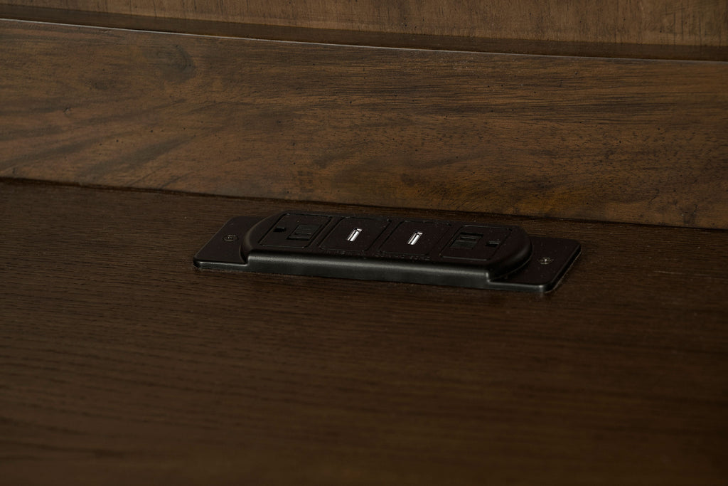 This burnished oak credenza with hutch is bound to enhance your office space. Stately and traditional in style, there is plenty of storage space with five drawers, two top cabinets, and two lower cabinets that lock for safekeeping. Crown molding detailing and paneling make for a magnificent display. Supportive bracket style feet provide stability and an attractive upgrade for this wood credenza. Include this piece in your traditional style office space. Key Features: • Executive home office collection finished in burnished oak • Features felt lined top drawers, 45mm full extension ball bearing glides, and bronze hardware • Credenza includes a power outlet (2AC/2USB), center keyboard drawer, two top drawers and middle drawer with removable dividers, one lockable file cabinet, and a cabinet with an adjustable shelf • Hutch includes a single drawer, two cabinets with clear tempered class door panels, and two adjustable shelves • Constructed with rubberwood, plywood, MDF, particle board, and white oak veneer