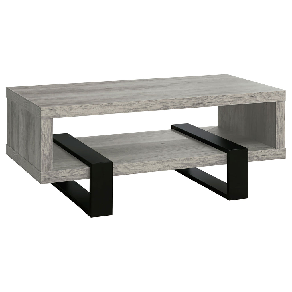 Experience a modern aesthetic with this rectangular coffee table that combines style and functionality. The grey driftwood finish highlights realistic wood grain, creating a rustic yet contemporary look. Crafted from durable engineered wood with a scratch-resistant laminate veneer, it offers long-lasting appeal. The bold black geometric legs provide sturdy support while adding industrial-inspired charm. Its versatile design and lower shelf make it a practical and stylish addition to any living room. Key Features: • Rectangular coffee table with sleek grey driftwood finish and realistic wood grain details • Engineered wood construction with eco-friendly, scratch-resistant laminate veneer for durability • Lower open shelf adds extra space for storage, organization, or decorative display pieces • Bold black geometric legs enhance its structure with a striking industrial-inspired aesthetic • Versatile finish seamlessly complements rustic, contemporary, or transitional interiors • Clean lines and sharp angles add modern charm to enhance your living room ambiance