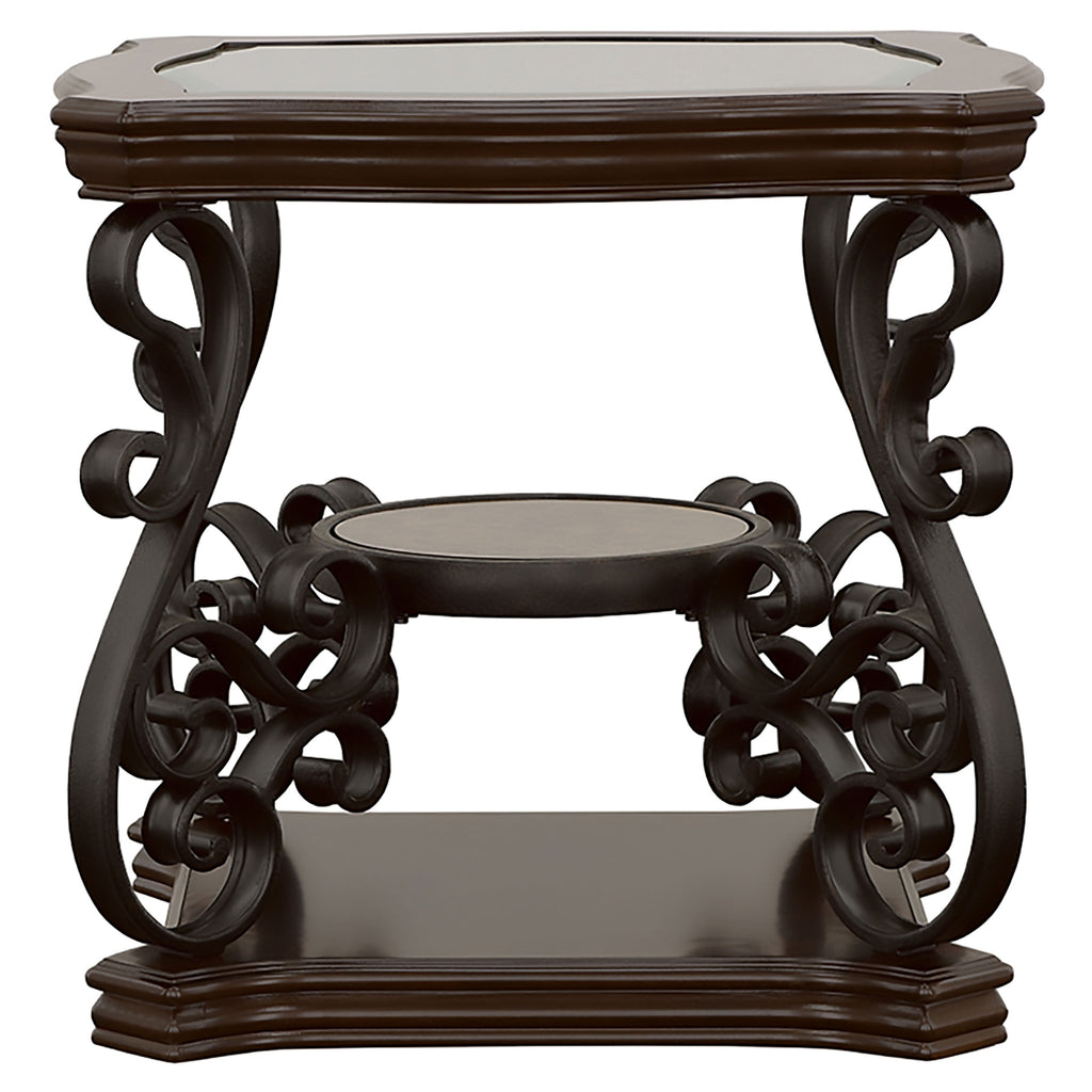 This elegant end table brings a blend of classic style and practicality to any living space. The clear tempered glass top offers a durable and polished surface, complemented by ornate scrollwork on the dark bronze powder-coated metal legs. The dark merlot finish highlights the engineered wood and cherry veneer construction, while the small middle shelf adds functionality with a polished wooden surface. Perfect for enhancing your living room with timeless charm and versatile utility. Key Features: • End table with a clear tempered glass top for a durable and elegant surface • Metal legs with a dark bronze powder-coated finish enhance sophistication • Dark merlot wood finish complements engineered wood and cherry veneer • Middle shelf with a polished wooden surface adds storage or display options • Intricate scrollwork design provides a classic and ornate aesthetic • Built with durable mixed materials of metal, wood, and veneer