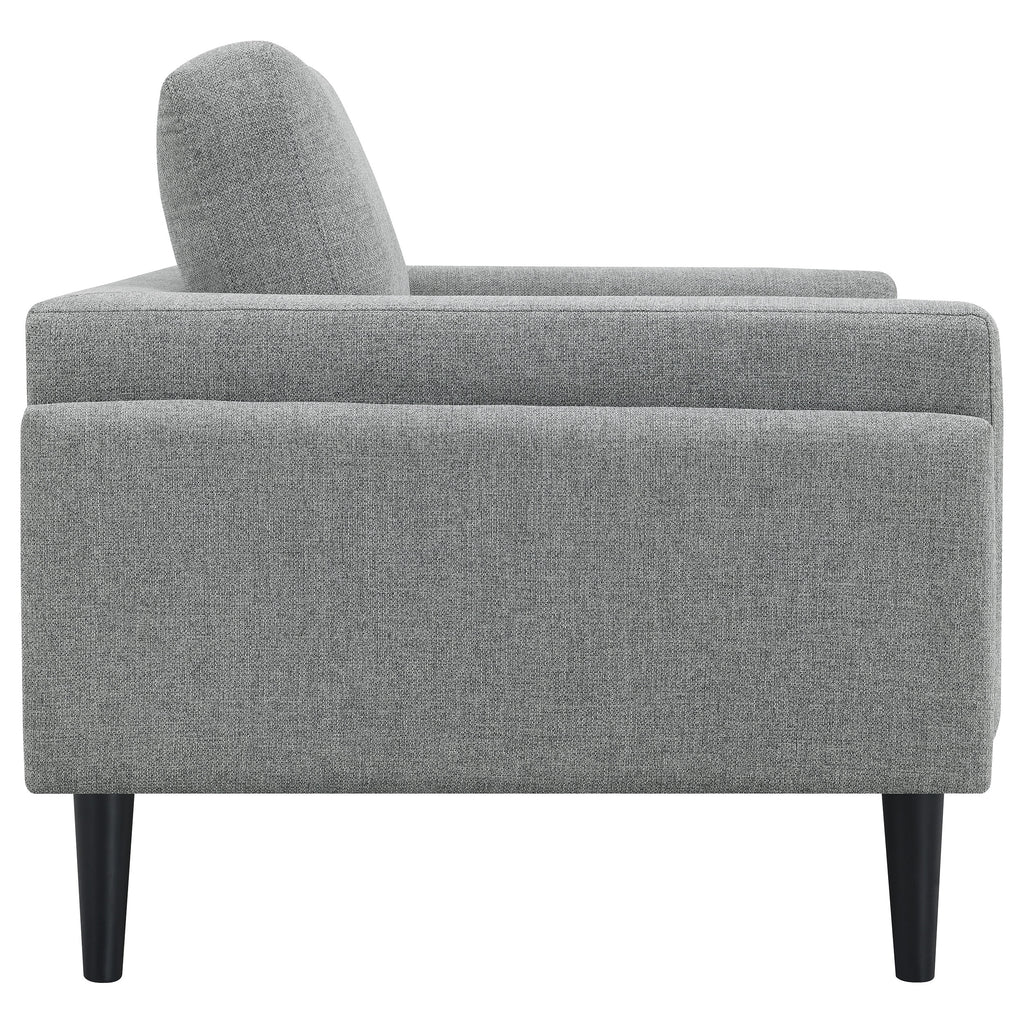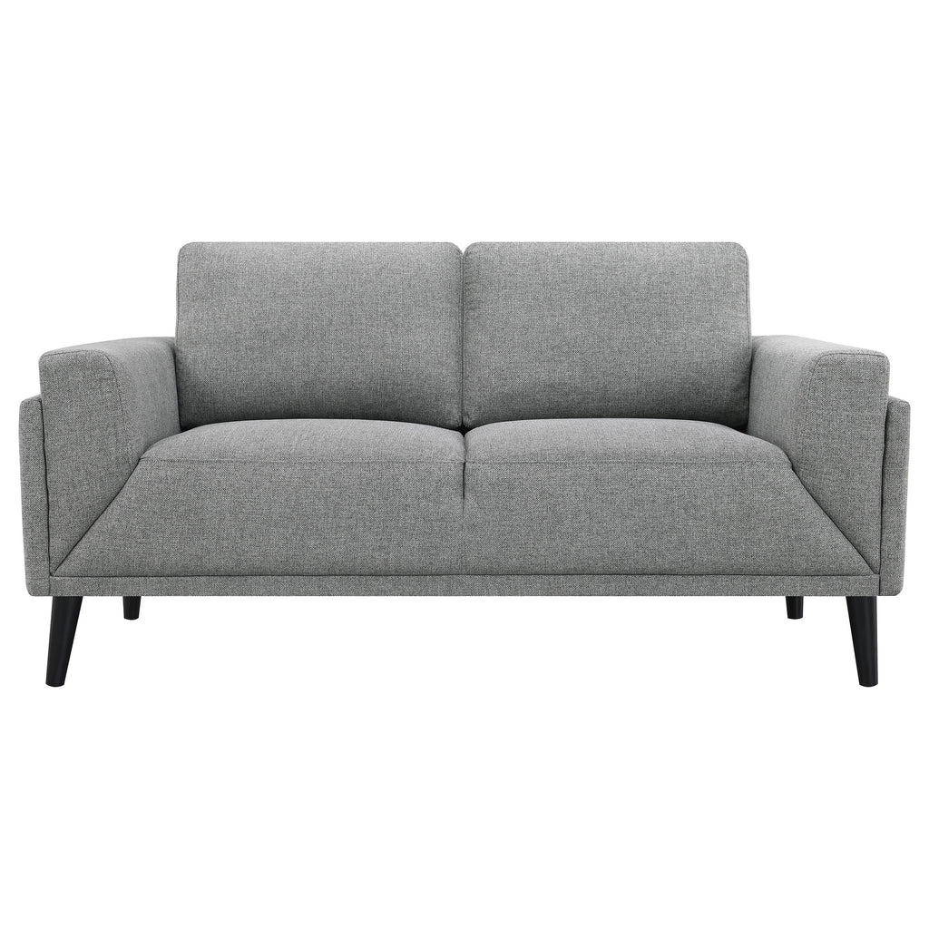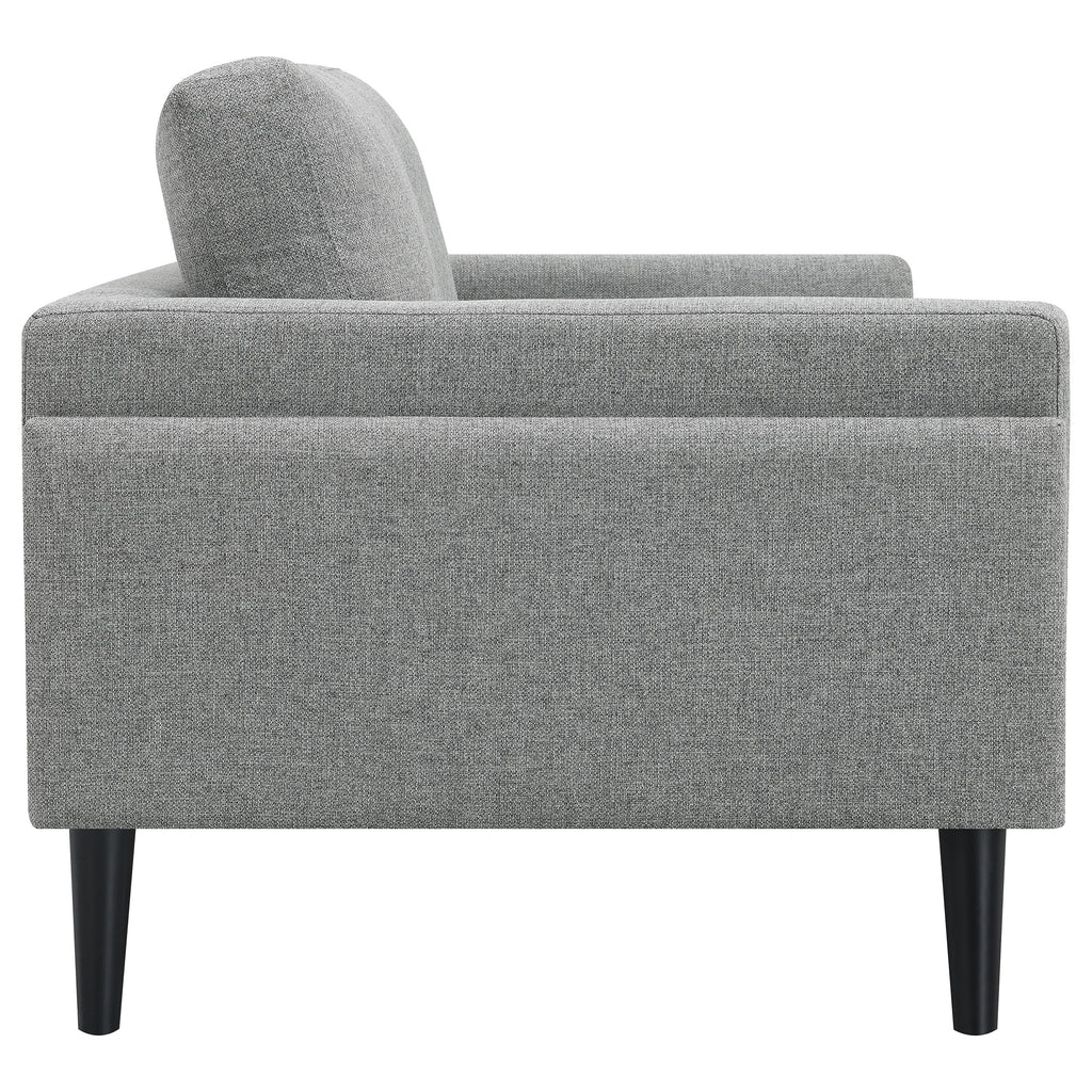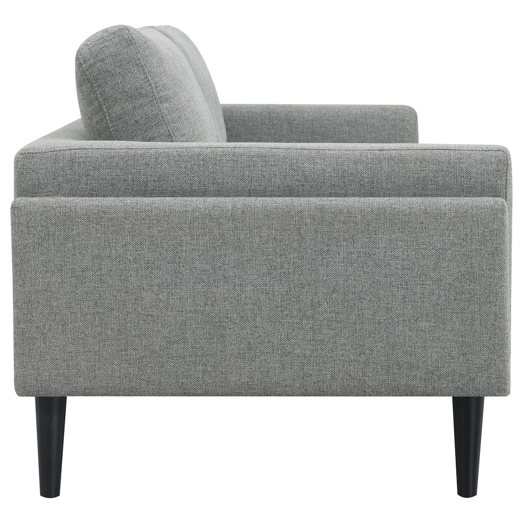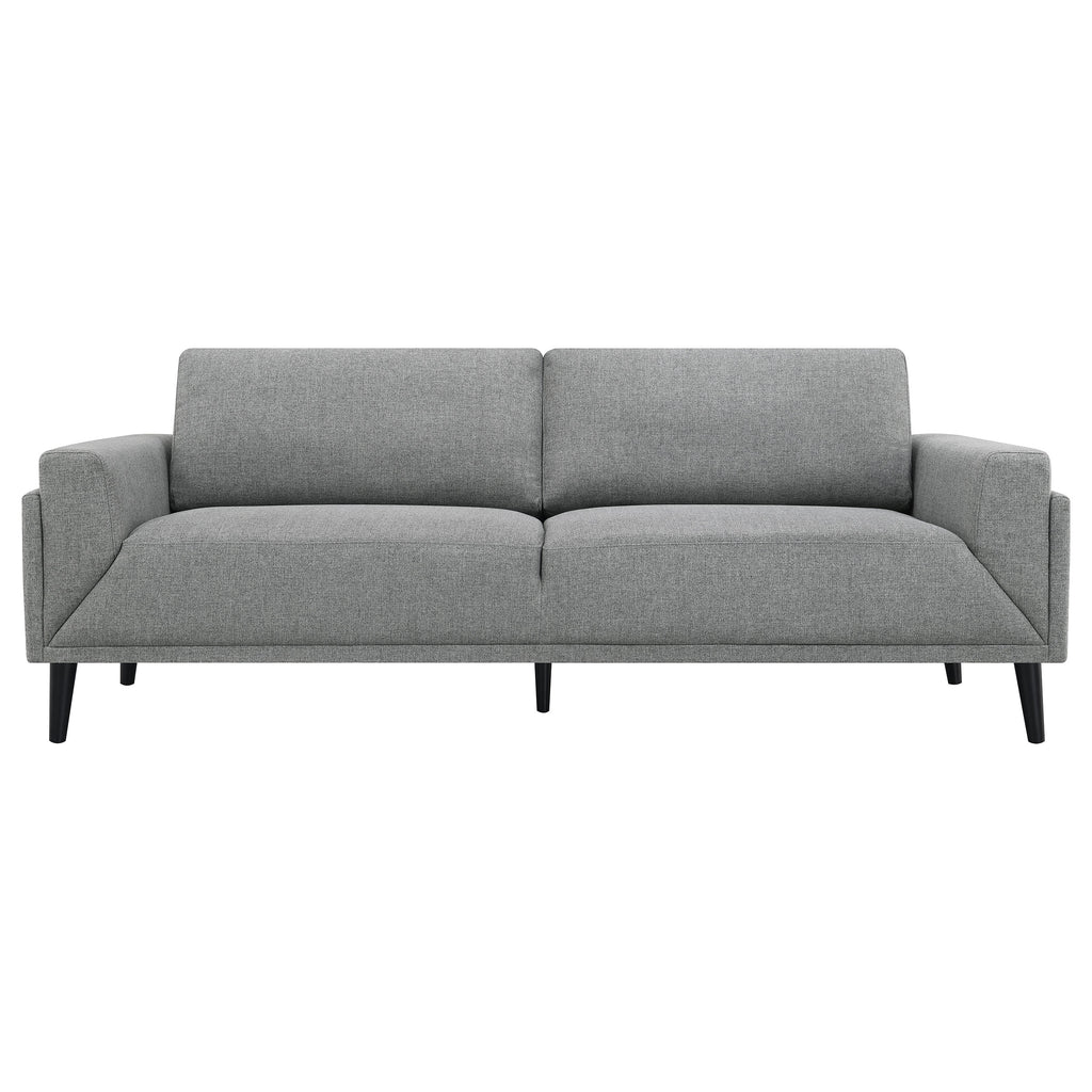 Welcome to the pinnacle of modern design with our sofa collection, where elegance meets innovation in a "frame within a frame" concept. This series, draped in a chic fabric, showcases an exquisite blend of clean lines accentuated by detailed topstitching. The track arms, enhanced with mitered front accents, further amplify its contemporary aesthetic. Prioritizing your relaxation, these sofas come equipped with reversible back cushions and a pocket coil seat construction, guaranteeing both coziness and lasting support. Elevating the design even further are the tall, black cylinder-shaped wooden legs, adding a touch of sophistication. This collection is not just about seating; it's an embodiment of style and comfort, curated for the modern home.