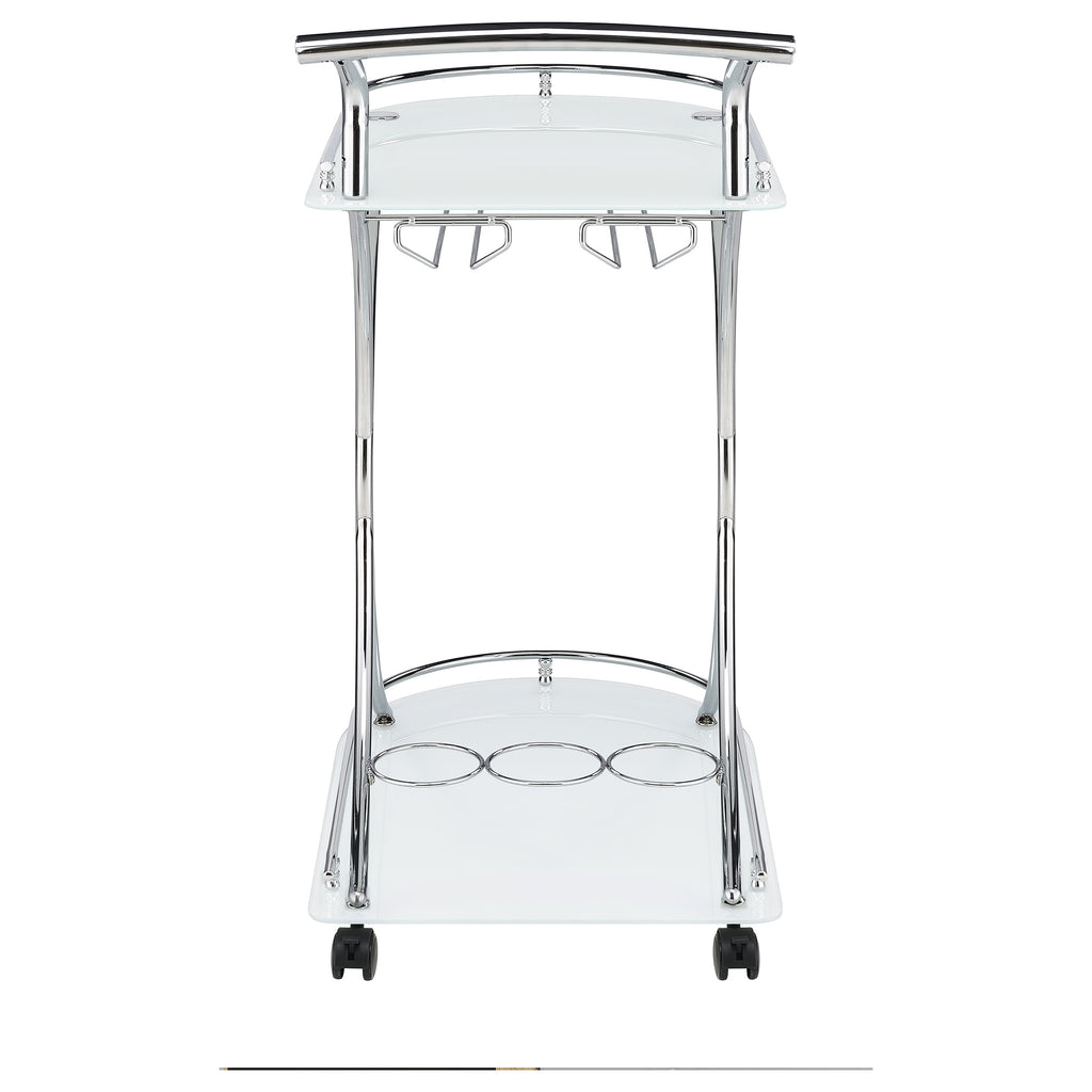 Recapture mid-century elegance with an enticing function. Slender construction elements form a graceful look in this mobile serving cart and add a lovely accent piece that's also useful for entertaining. Sleek black glass serves as a top and bottom shelf, contributing to an upscale flavor. Chrome finish metal accents round out a luscious palette. Serve and store with a pair of wine bottle holders and a stemware rack. Key Features: • Two-tier bar cart with black tempered glass shelves and chrome metal frame • Curved chrome silhouette creates sleek contrast against dark shelf surfaces • Integrated stemware rack and wine bottle holder keep essentials secure • Raised guardrails on each tier offer added safety while serving or moving • Smooth-rolling casters include locking function for stable placement • Crafted from steel and tempered glass for modern durability and style