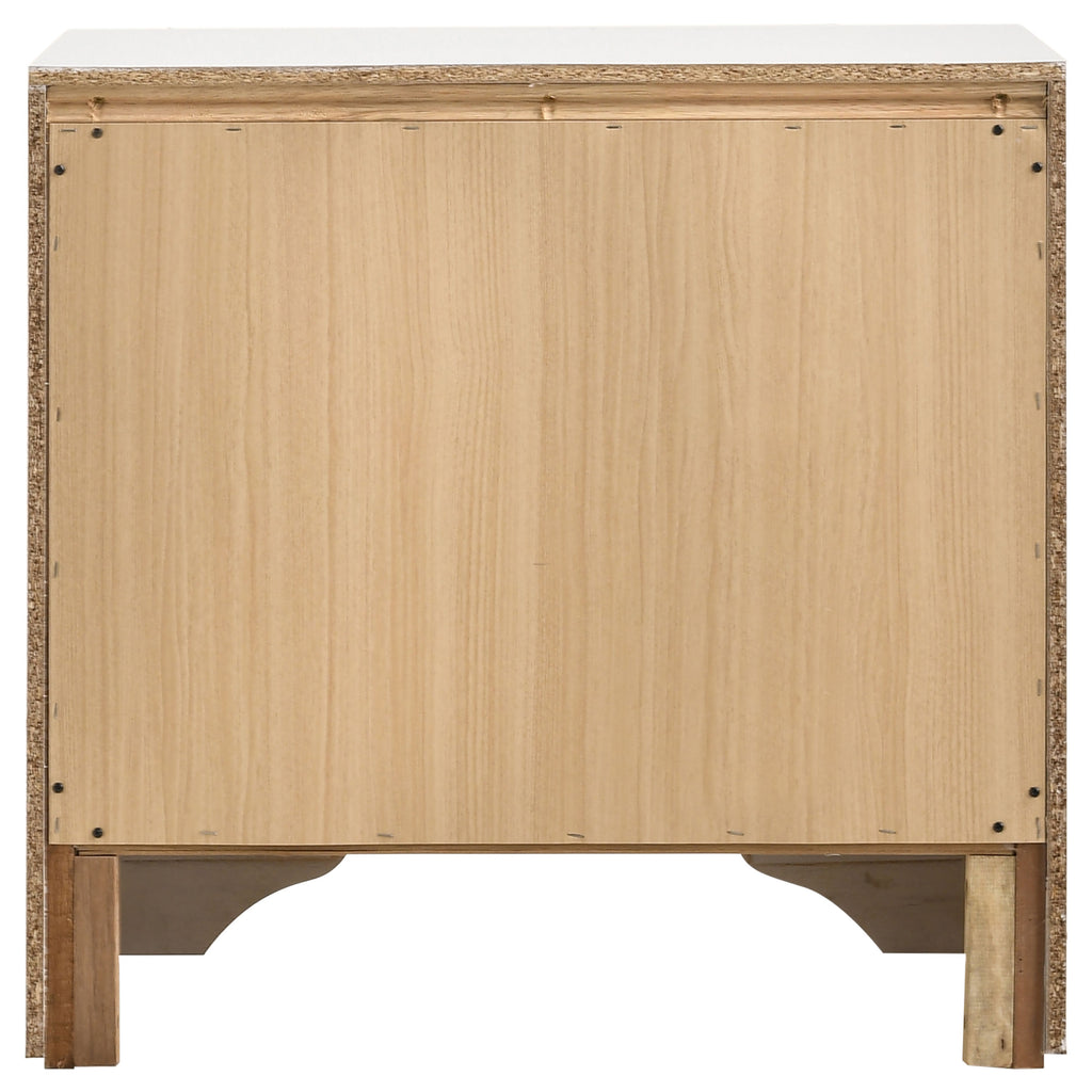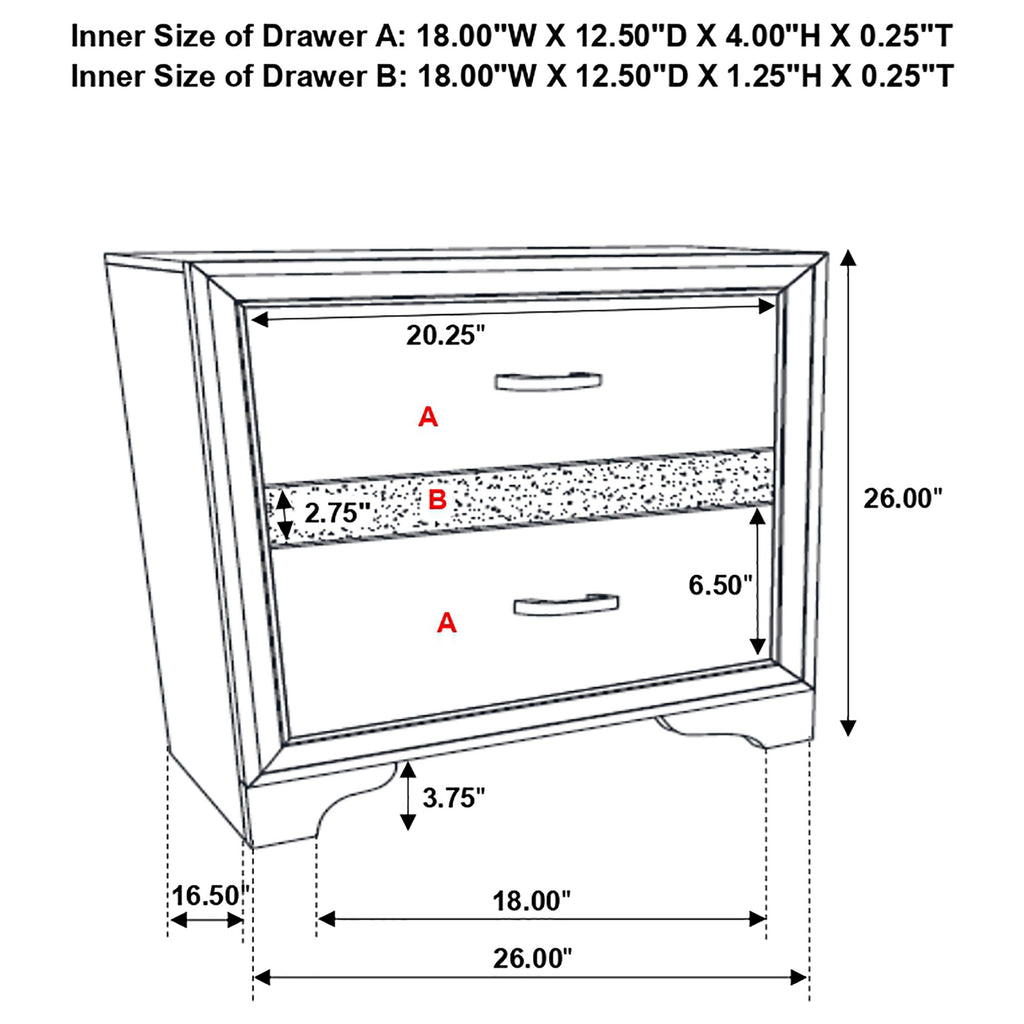 Infused with timeless glamour, this three-drawer nightstand brings refined character to any bedroom. Its linear profile is accented by elegant framing and a glittering center panel that conceals a hidden felt-lined drawer, ideal for delicate accessories. Smooth metal-extension glides ensure effortless drawer operation, while crystal-inspired pulls catch the light with radiant sparkle. Built from engineered wood and finished in a textured laminate veneer, it delivers durability with sophisticated transitional charm. Key Features: • Three-drawer nightstand with smooth full-extension glides • Hidden felt-lined drawer concealed behind glitter accent panel • Crystal drawer pulls enhance the glamorous design • Bright white finish with subtle textural detail on sides • Classic bracket base offers transitional styling • Crafted from engineered wood with laminate surfaces