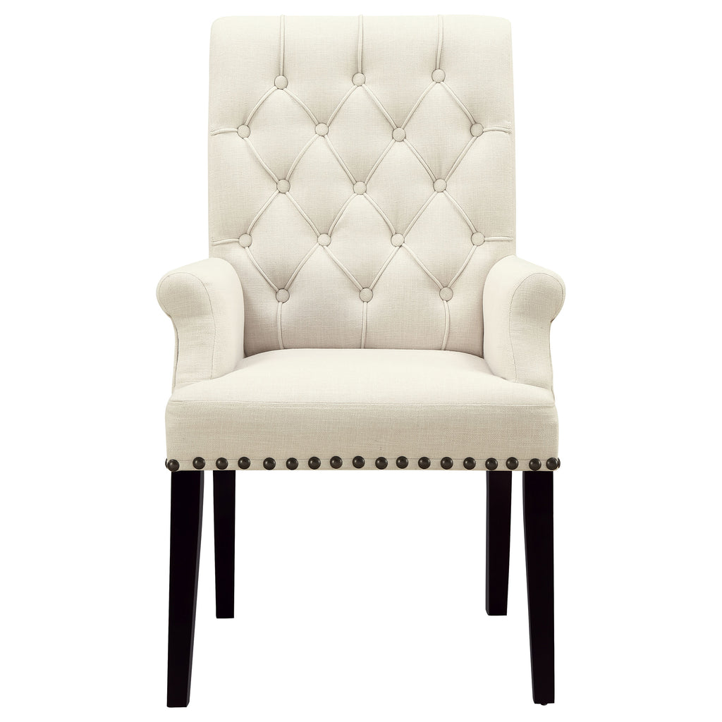 Designed for both luxury and support, this arm chair brings an elegant presence to any dining space. Its button-tufted high back and rolled top lend a timeless aesthetic, while the addition of padded armrests enhances comfort. Hand-applied nailhead trim offers a sophisticated finishing touch, complementing the chair’s tailored silhouette. A generously padded seat and sturdy legs ensure both durability and long-lasting comfort, making it a stunning choice for formal and everyday dining alike. Key Features: • Arm chair with a button-tufted back and elegantly rolled top • Arm chair with a button-tufted back and elegantly rolled top • Arm chair with a button-tufted back and elegantly rolled top • Arm chair with a button-tufted back and elegantly rolled top • Arm chair with a button-tufted back and elegantly rolled top • Arm chair with a button-tufted back and elegantly rolled top