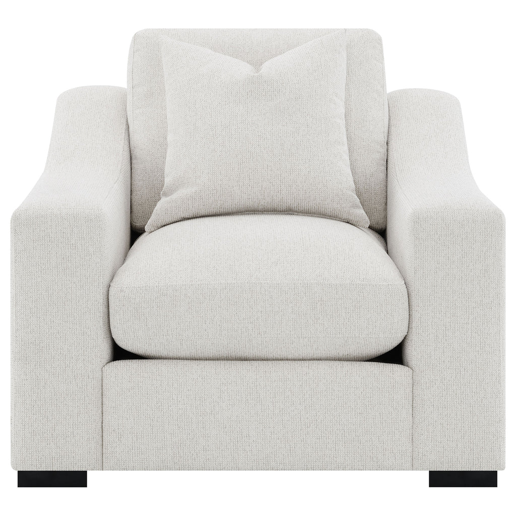 Create your favorite cozy reading nook with this transitional lounge chair, upholstered in a white trillium polyester blend fabric across elegant sloped track armrests and a tailored top-stitched reversible box seat and back cushion. A solid wood frame beneath offers long-lasting stability as bold and contrasting cappuccino finish block style legs peek out from the bottom and offer a slight elevation over decorative rugs and flooring. Key Features: • Soft sloped, wide track arms • Relax in trillium filled cushions that create a down-like seating comfort • Reversible seats and backs • Boxed seat and back cushions with top stitching for a tailored look • Wide solid wood legs in cappuccino complement the arm width