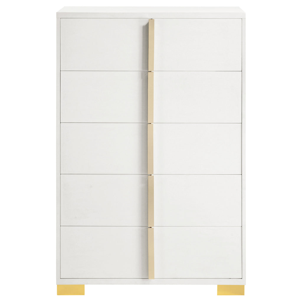 Minimalism never looked so elegant as it does in this elegant five-drawer chest, an excellent option for your updated bedroom ensemble. Modern design details produce a chic vertical chest with an Art Deco vibe and tons of storage space. Made of wood products, this five-drawer chest features a versatile finish with accenting from gold finish metal, placed carefully to emphasize a geometric linear effect. Store incidentals and accessories in drawers operating smoothly on center metal glides. English dovetail drawer construction embellishes this chest’s quality, as vertical gold metal drawer hardware offers a unique impact. Key Features: • Elegant five-drawer chest with modern design details and Art Deco vibe • Made of wood products with versatile finish and gold finish metal accents • Smoothly operating drawers on center metal glides with English dovetail drawer construction • Vertical gold metal drawer hardware for unique impact • Minimalist design with ample storage space