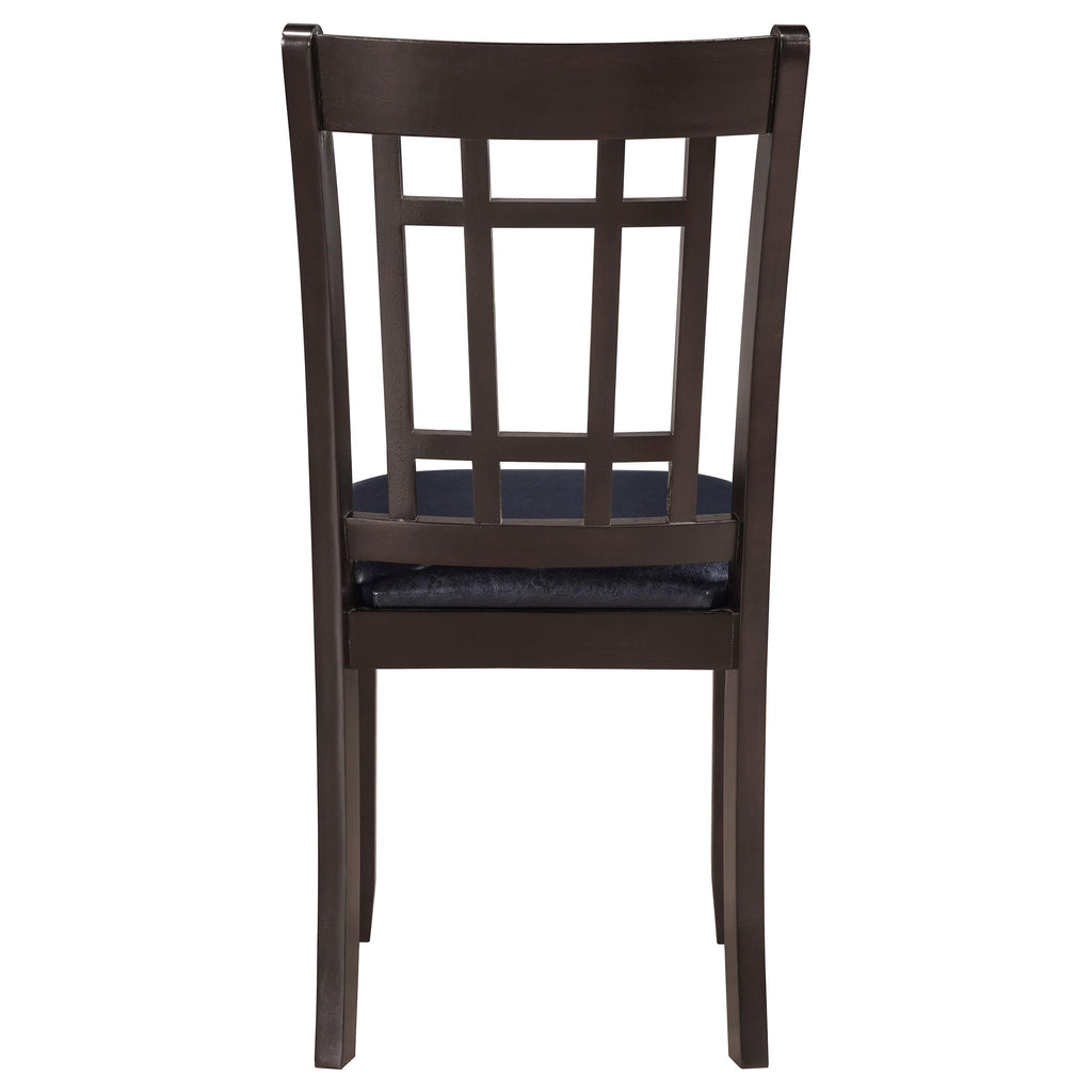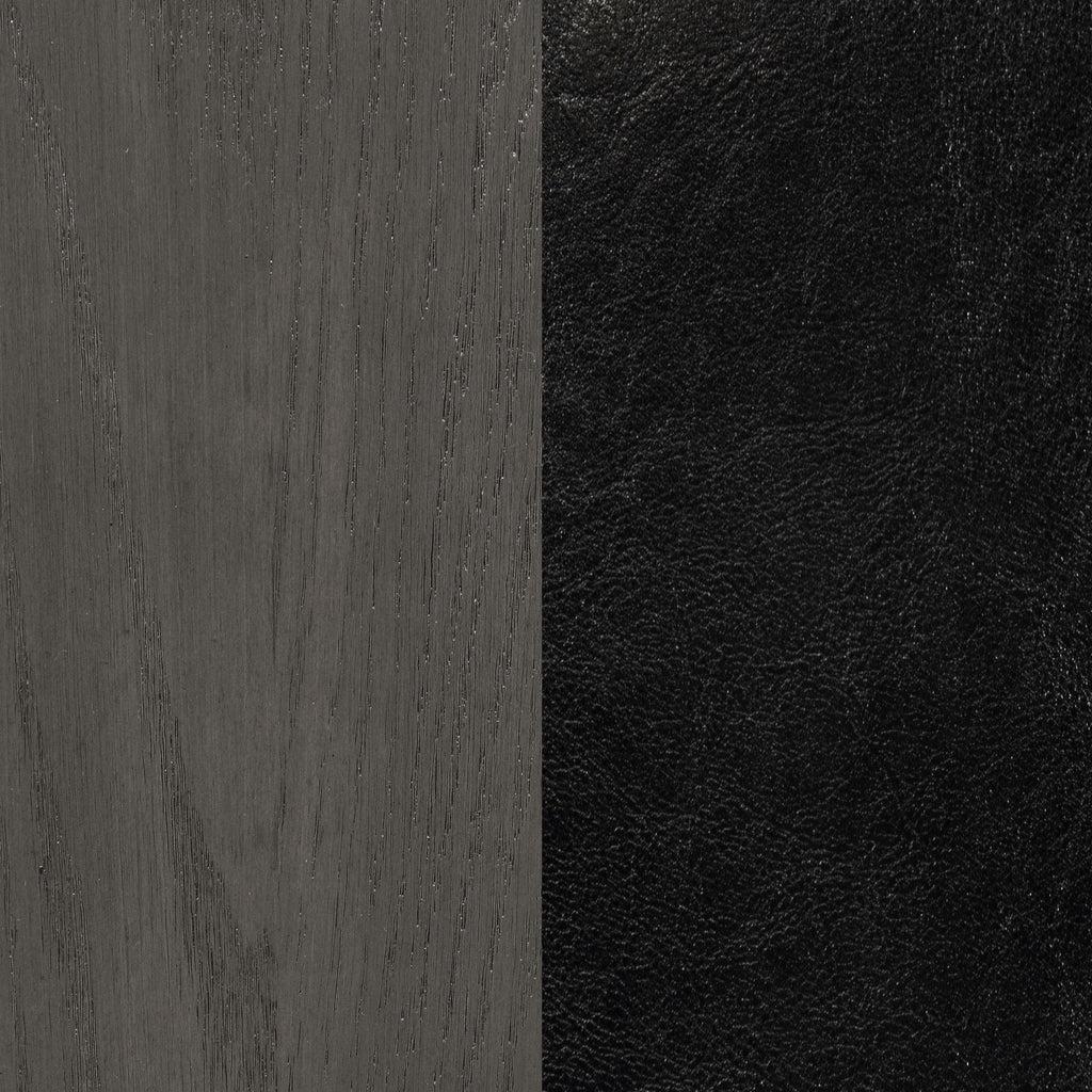 A combination of vertical and horizontal slats creates a window pane effect for this charming transitional dining chair. An armless silhouette is a versatile choice for relaxed, everyday living. The chair boasts a medium grey finish over rubberwood construction. Webbed seating and black faux leather upholstery combine for stylish comfort. Invite friends and family to have a seat and enjoy a lovely meal. Key Features: • Dining side chair with open grid backrest and gently curved back support • Medium grey finish highlights transitional styling and natural wood texture • Black faux leather upholstered seat provides cushioned comfort and easy care • Seat constructed with webbing and frame support for long-lasting durability • Armless profile allows for flexible seating arrangement around any table • Crafted from solid hardwood, engineered wood, and foam-padded leatherette
