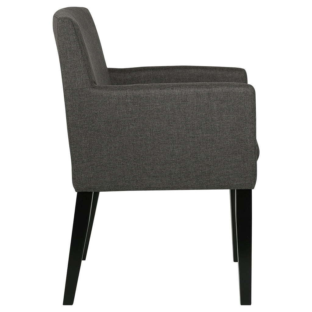 Enhance your casual dining room with these stylish mid-century-inspired dining chairs. Featuring cushioned arms wrapped in durable charcoal grey fabric, they offer both comfort and style. The sleek design and versatile color effortlessly complement any dining space, creating a cozy and inviting atmosphere. Elevate your dining experience with these chic and comfortable chairs. Key Features: • Upholstered in durable charcoal grey fabric for a stylish and comfortable look • Sleek mid-century-inspired design to enhance any dining space • Cushioned arms for added comfort • Versatile color to complement any décor • Easy to assemble for a quick and effortless upgrade to your dining room