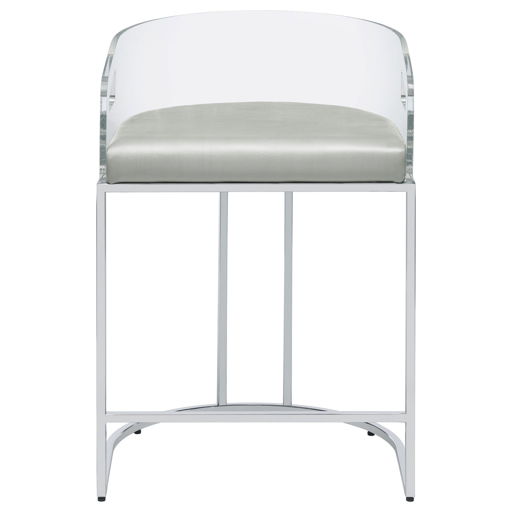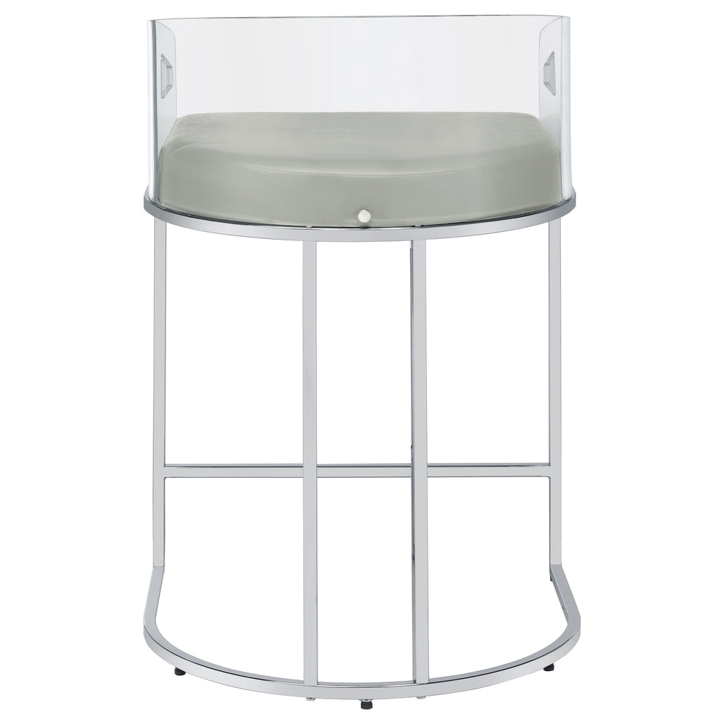 Ultra-modern with a retro-inspired vibe, this pair of stools make a striking piece to a dining room space. With a curved backrest in a clear acrylic material, each stool offers an open and airy design. Rest comfortably on a leatherette cushion as you dine or sip a cocktail. In addition, each stool is supported by a slim metal legs in a lustrous chrome finish and a base shape that mimics the rounded acrylic backrest. Pull up a pair of these stools to a kitchen bar or complete a compact home bar. Key Features: • Ultra-modern with a retro-inspired vibe, these stools feature a curved backrest in a clear acrylic material, leatherette cushion, and slim metal legs in a lustrous chrome finish • Base shape mimics the rounded acrylic backrest for a cohesive look • Open and airy design offers a comfortable seating experience • Ideal for a kitchen bar or compact home bar • Striking piece to a dining room space