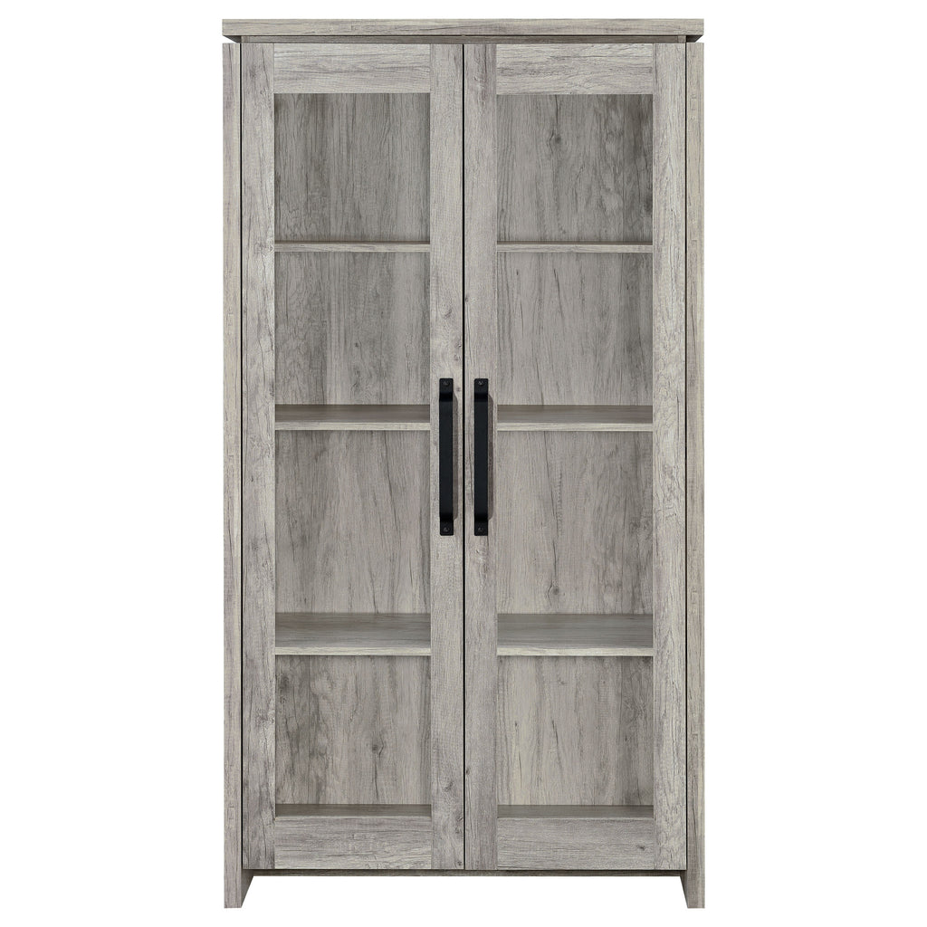 This tall curio cabinet makes for an impressive addition to a well-appointed home. The charming cabinet has classic sense of style and design. Two glass doors with contrasting dark hardware give the curio a distinguished appearance. The doors provide easy access to eight compartmentalized shelves offering abundant storage space. Finished in grey driftwood for a stylish look appropriate for any living room or den. Key Features: • Tall accent cabinet with a beachy grey driftwood finish • Two glass doors reveal eight adjustable interior compartments • Black hardware adds contrast and industrial-inspired detailing • Ideal for storage or display in coastal or casual interiors • Crafted from engineered wood, glass, and laminate veneer • Includes tip-over restraint for stability
