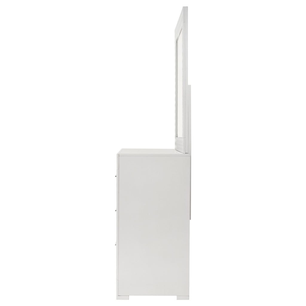 Bring a touch of modern luxury to your bedroom with this dresser and mirror set. Featuring a high gloss finish and 3-dimensional diamond tile emboss, this set exudes contemporary Italian style. The dresser offers ample storage with six spacious drawers, including felt-lined top drawers for delicate items. The matching mirror adds a cohesive element, enhancing the set's sophisticated design. This dresser and mirror set is perfect for those who appreciate refined aesthetics and quality craftsmanship. Key Features: • Luxurious dresser and mirror set with white high gloss finish • Dresser features six drawers with felt-lined top drawers • 3-dimensional diamond tile emboss for a modern touch • Matching mirror enhances the overall aesthetic • Constructed from solid hardwood and engineered wood