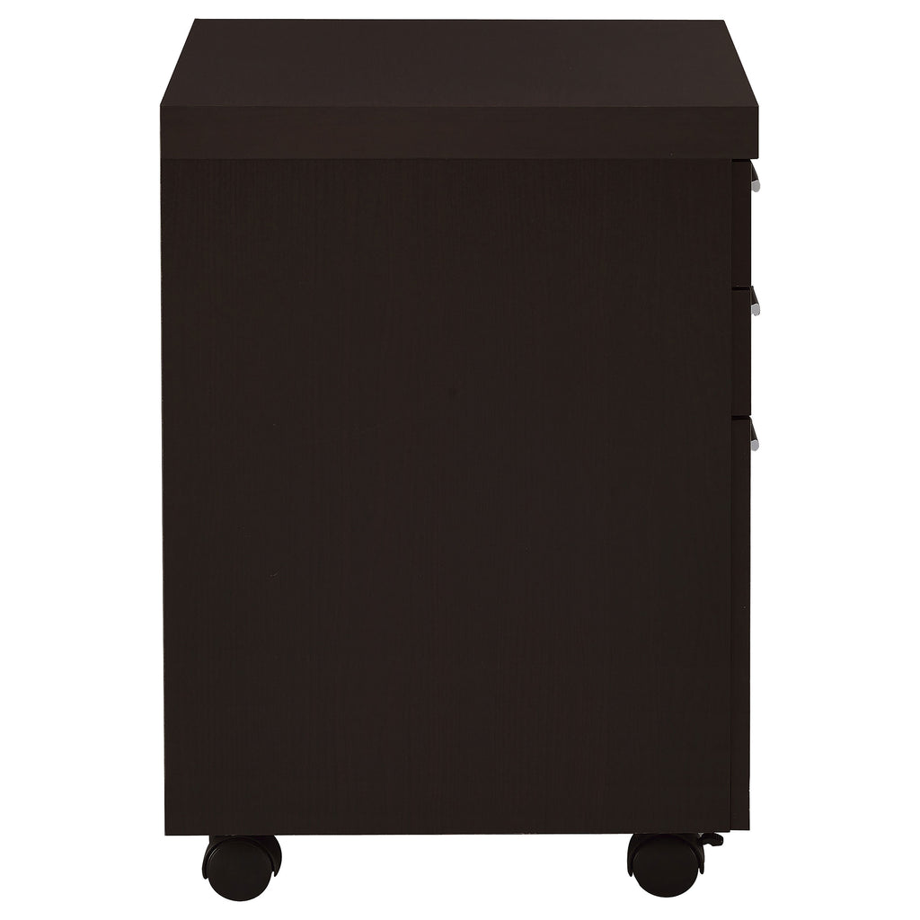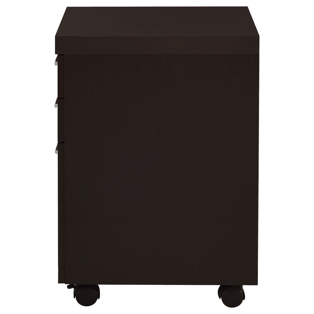 Stay organized in style with this mobile file cabinet, designed for both functionality and modern appeal. Featuring a rich cappuccino finish, this compact storage solution seamlessly blends into any home or office setup. Two spacious drawers and a file compartment provide ample space for documents, supplies, and office essentials. The built-in casters ensure smooth mobility, allowing for effortless repositioning. Sleek silver hardware accents add a contemporary touch, while its durable engineered wood construction ensures lasting use. Key Features: • Sleek mobile file cabinet with a modern cappuccino finish • Two drawers and a file compartment for organized document storage • Designed to accommodate both legal and letter-size files • Smooth-rolling casters provide effortless mobility in any office space • Durable MDF and engineered wood construction for long-lasting use • Sleek silver handles enhance the cabinet’s contemporary design