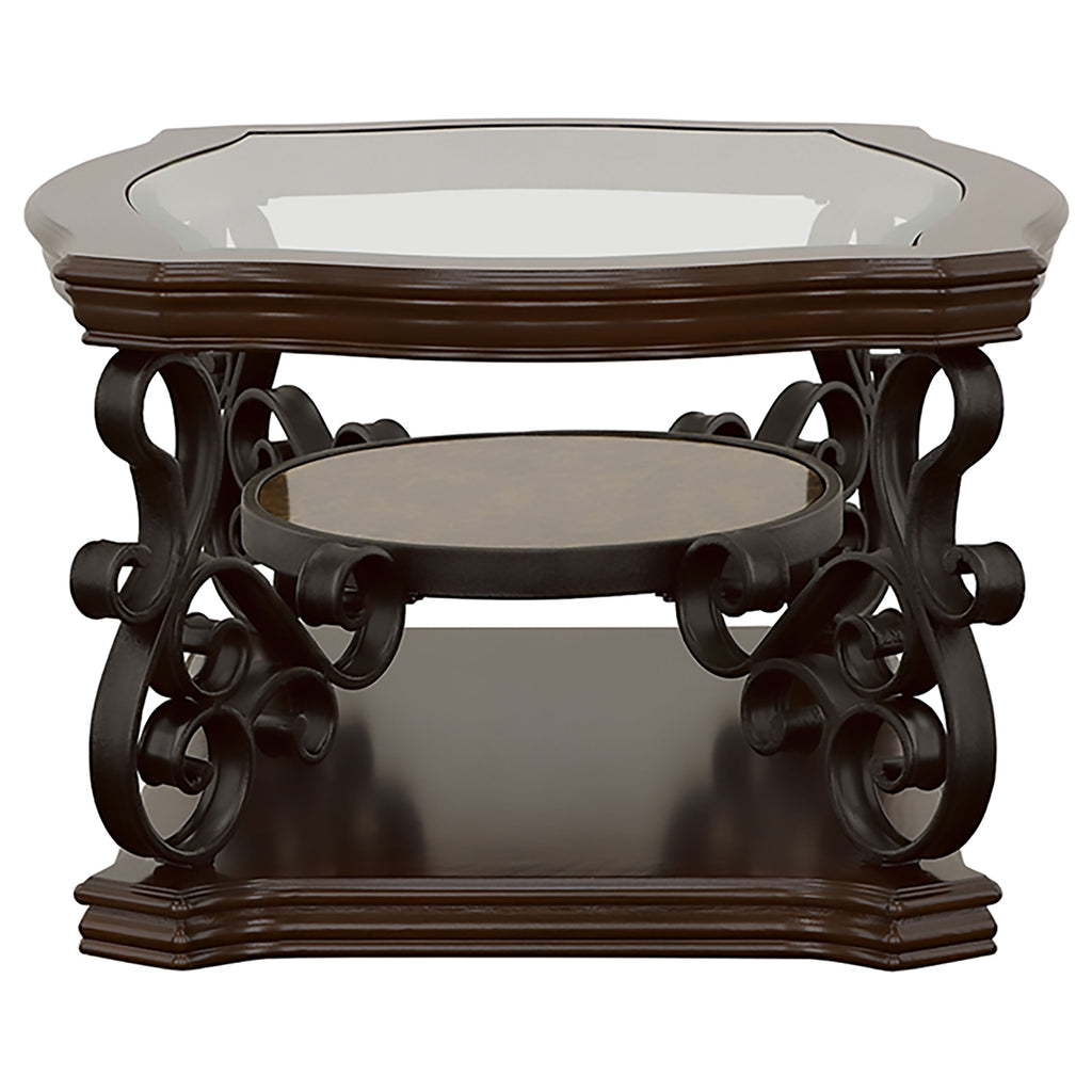 This elegant coffee table blends timeless design with practical functionality. The clear tempered glass top offers durability and a polished look, while the dark bronze powder-coated metal legs add a refined touch. A dark merlot wood finish highlights the engineered wood and cherry veneer construction. The middle shelf features a glossy wooden surface, offering additional display or storage space. Intricate scrollwork detailing enhances the classic appeal, making it a perfect centerpiece for any living room. Key Features: • Coffee table with a clear tempered glass top for a sleek and durable surface • Metal legs feature a dark bronze powder-coated finish for a refined appearance • Dark merlot wood finish highlights engineered wood and cherry veneer • Middle shelf with a polished wooden surface for display or storage needs • Ornate scrollwork accents provide a classic and timeless design • Sturdy construction with mixed materials of metal, wood, and veneer