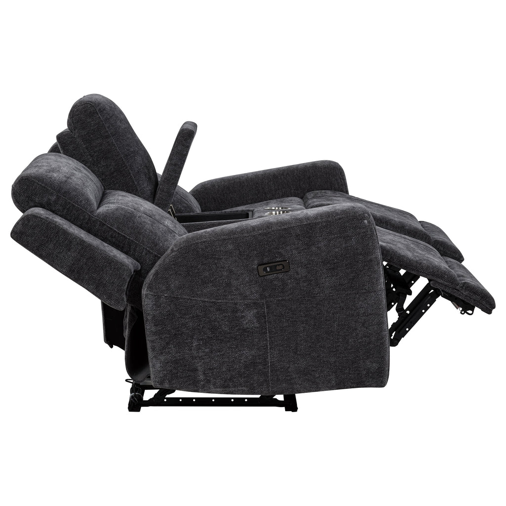 Unwind in perfect sync with this chenille power reclining loveseat, crafted for shared comfort and convenience. Dual recliners offer smooth, quiet motion at your touch, while a center console adds thoughtful storage with a lift-top compartment and two removable stainless steel cup holders. Wrapped in soft, textured chenille and reinforced with a durable metal frame, this piece blends everyday luxury with functional ease. Key Features: • Power loveseat with smooth dual recliners offers effortless, personalized comfort • Ivory chenille upholstery adds softness and a subtle textured visual appeal • Center console features lift-top storage for remotes, books, or other items • Includes two removable stainless steel cup holders for clean and easy use • Durable metal framing supports long-term strength and daily reliability • Polyester chenille fabric balances plush comfort with easy-care maintenance