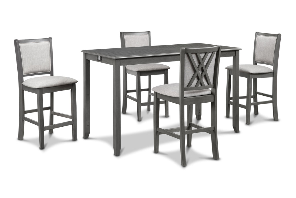 The Amy 5-piece 60” counter dining set is a perfect union of practicality and. This comprehensive set includes a counter-height 60" dining table with a convenient storage shelf, four chairs, along with hardware, and assembly instructions for hassle-free setup. Crafted with precision, solid Rubberwood and Mindi veneers ensure both durability and aesthetic appeal. The contemporary gray finish, achieved through a multistep process, beautifully highlight the wood's natural grain. The 4-person seating arrangement around the spacious table, featuring a handy storage shelf for kitchenware and collectibles, creates an inviting space for family dinners and game nights. Comfort takes center stage with the counter chairs, boasting 100% polyester light gray upholstered seat and back cushions, supported by solid wood legs reinforced with base stretchers doubling as footrests. The distinctive design elements, including a fancy face reverse diamond veneer tabletop, interlocking double X frame chair back, and tapered table legs, add a touch of sophistication. Enhancing functionality, the dining set features a convenient power outlet and two USB charging ports, ensuring your devices are always ready for homework, crafting, or game play. The Amy dining set seamlessly combines form and function for a timeless addition to your home.