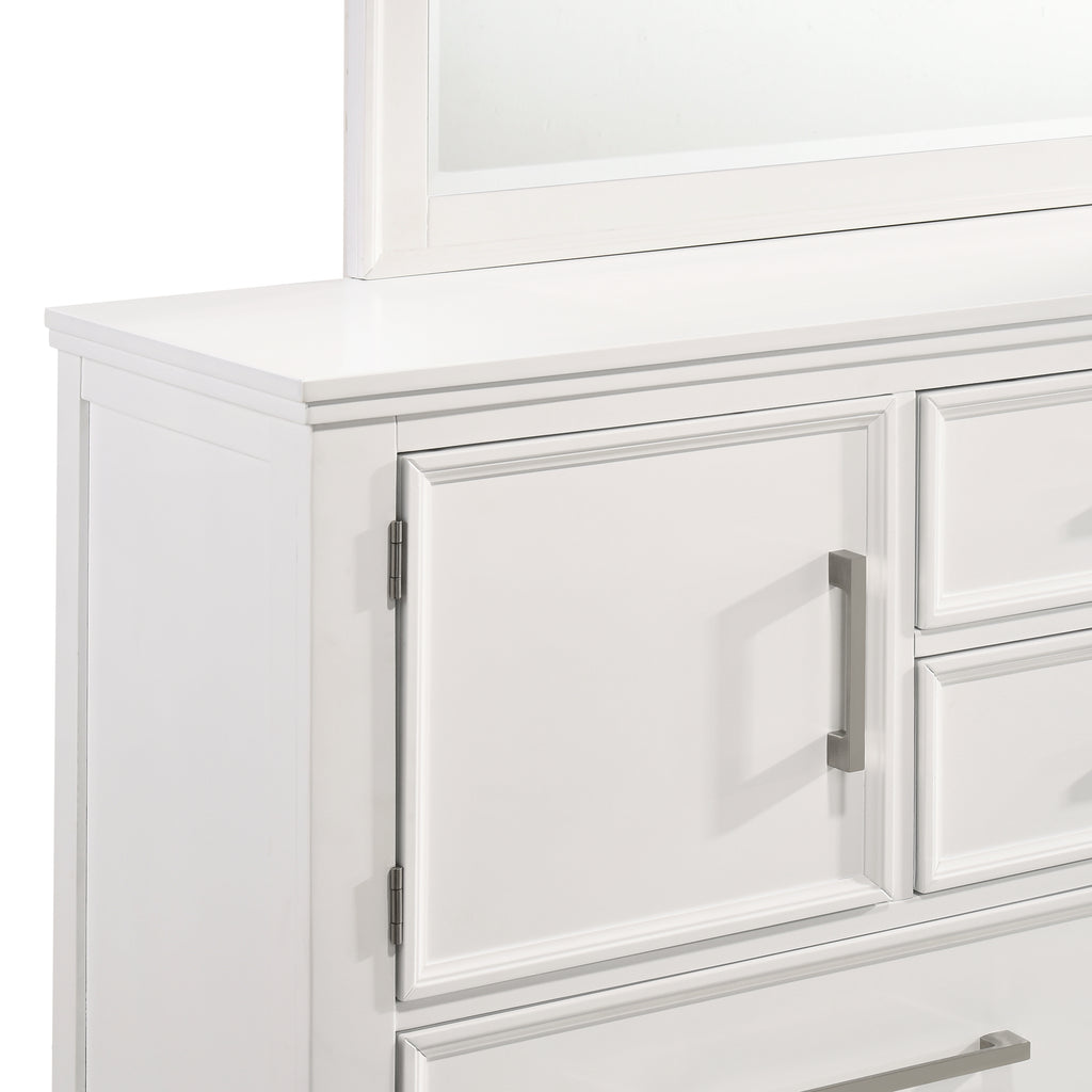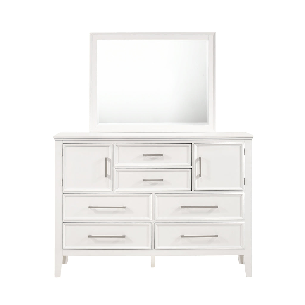 The Andover Mirror for Dresser in White is a perfect blend of durability, style, and functionality, making it an elegant addition to your bedroom. Expertly crafted from solid Rubberwood, manufactured woods, and wood veneers, this mirror is built to last while showcasing the natural beauty of real wood. The semi-gloss white finish offers a crisp, versatile appeal that effortlessly complements a wide range of décor styles, whether modern or traditional, enhancing your space with a fresh and refined look. The pristine, low-distortion beveled glass mirror is beautifully encased in picture frame-style moldings, providing a clean and sophisticated appearance that adds a touch of timeless elegance to any room. This mirror not only serves a practical purpose but also elevates the style of your bedroom with its understated elegance.