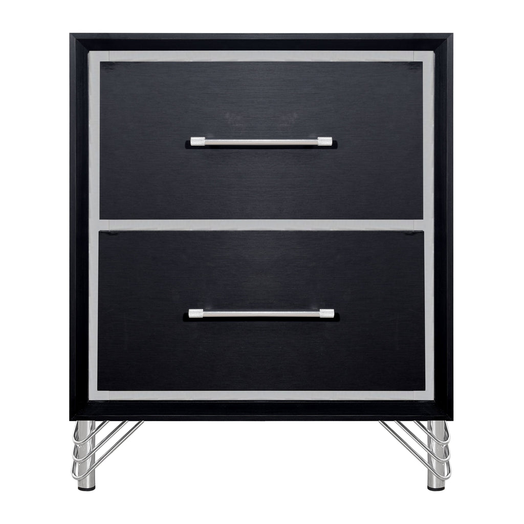 The Ava 2 Drawer Nightstand in Ebony blends modern glamour with everyday functionality. Crafted from engineered wood with eco-friendly black laminate, it features silver mylar accents and sculpted legs for a chic finish. Two spacious drawers offer smooth operation with English dovetail joinery and Kenlin ball-bearing glides. A stylish and practical piece that adds a touch of sophistication to any bedroom.