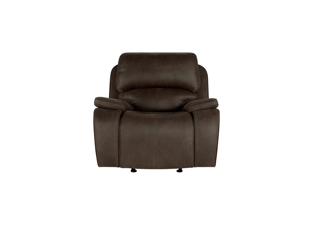 Unwind in luxury with the Brookings Glider Recliner with Power Headrest & Footrest in rustic brown. Crafted with an upholstered leather-look polyester/pu fabric, this recliner boasts the elegance of genuine leather without the hefty price tag. Tailored to perfection, its pillowed arms and double stitched racetrack arms exude sophistication, while distinctive baseball contrast stitching on the bucket seats and plush backrests make a bold style statement. Experience ultimate comfort with the fully upholstered chaise recliner footrest and adjustable headrest position, all supported by hardwood and manufactured wood frames for lasting durability. Enjoy convenient lifestyle features like USB-C ports for device recharging and customizable footrest and headrest positions at the touch of a button. Rock yourself to relaxation with the smooth gliding action of this recliner, complemented by its casual yet transitional style that adds a cozy, lived-in ambiance to any home.