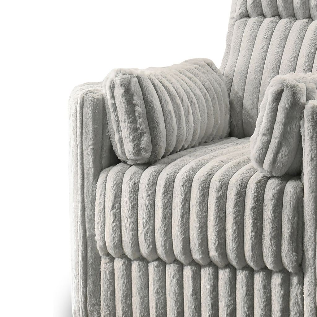 The Embrace Swivel Living Room Accent Chair in gray combines comfort and style with practical functionality. Upholstered in 100% gray polyester fabric with a soft, blanket-like texture, this chair is designed for ultimate relaxation. It includes one swivel chair and two side accent pillows that complement its luxurious ribbed channel fabric. The high-density, resilient foam cushions provide supportive and comfortable seating, enhancing the overall lounging experience. Built with a strong and durable frame made from a combination of solid and manufactured woods, this chair ensures long-lasting quality. The smooth swivel action allows for easy movement and engagement in conversations. The versatile, transitional styling of the Embrace collection, paired with the abundance of snuggly pillows, invites you to lounge and unwind in unparalleled comfort.