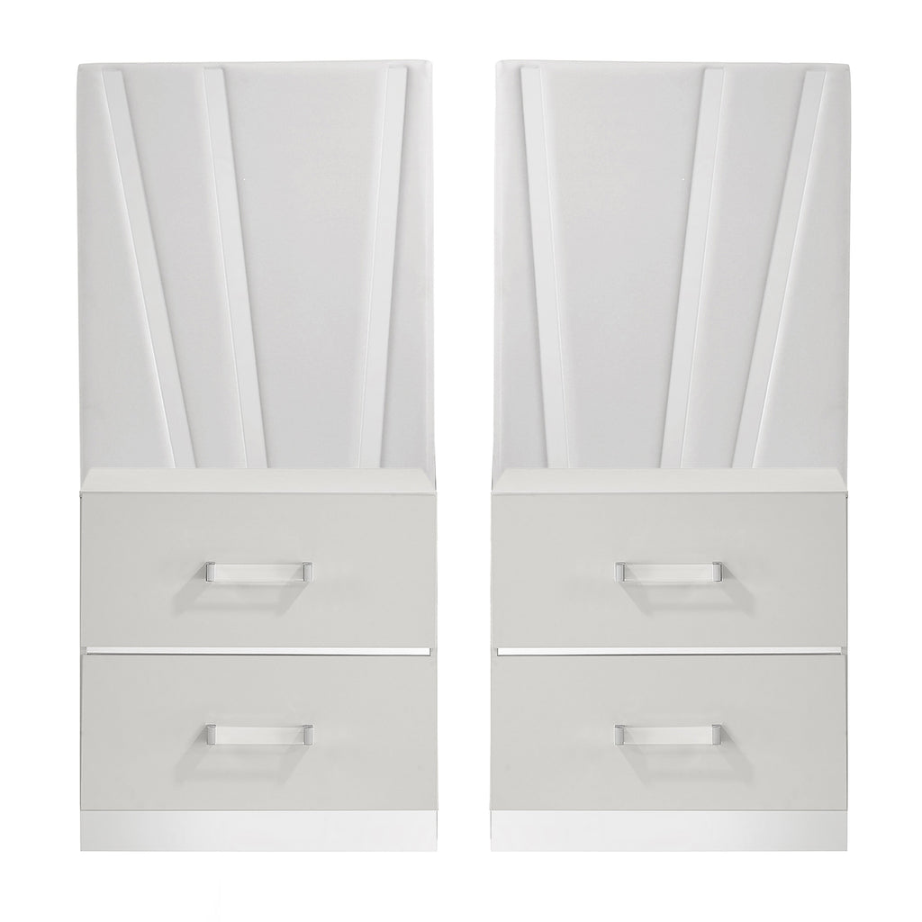 The Europa decorative back panels are designed for use with the Europa Nightstand. The Europa's sophisticated look is achieved through a gleaming white finish, mylar accents, and acrylic drawer pulls. Quality craftsmanship is evident in the eco-friendly manufactured woods, assembled for durability, with surfaces finished in a glossy white topcoat and padded upholstery. Upscale extras include silver mylar pedestal bases and decorative panel accents, enhancing the glamour of these nightstands. The sturdy, well-constructed drawers feature dovetail joinery and ball bearing glides for a durable, easy-glide operation, with interiors finished for snag-free storage. The two-drawer nightstands offer ample storage for bedside essentials. Choose the Europa Nightstands to add a touch of modern luxury and practicality to your bedroom.