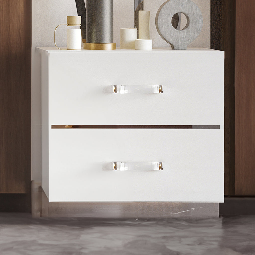 The Europa 2 Drawer Nightstand in white combines sleek, modern design with practical functionality. This nightstand features a gleaming white finish, mylar accents, and acrylic drawer pulls for a sophisticated look. Constructed with eco-friendly manufactured woods, it is built for durability, with surfaces finished in a glossy white topcoat. Upscale extras include a silver mylar pedestal base that elevates the glamour of this piece. The drawers are well-constructed with dovetail joinery and ball bearing glides, ensuring a durable, easy-glide operation, with interiors finished for snag-free storage. The two-drawer nightstand provides ample storage for all your bedside essentials. Choose the Europa 2 Drawer Nightstand for a blend of contemporary style and practical design.