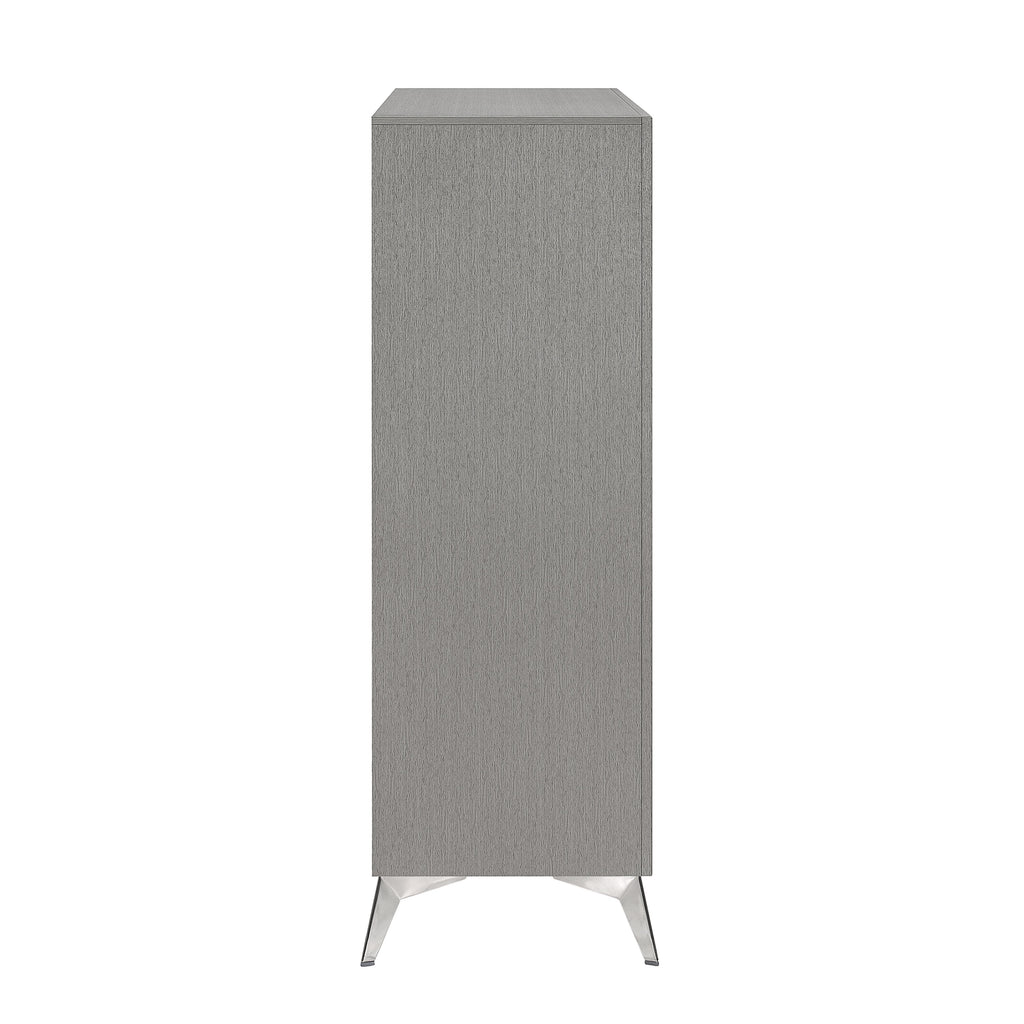 The Huxley 5-Drawer Chest in Gray combines contemporary glam with durable craftsmanship, making it a perfect addition to any modern bedroom. This chest is carefully crafted from manufactured woods and eco-friendly decorative laminate, ensuring it will last for years. It features clean lines enhanced with metallic accents and flared silver legs for a modern touch. The inviting gray finish provides a sleek, sophisticated look that complements contemporary interiors, creating a calming atmosphere. The neutral tone pairs beautifully with the metallic accents, adding a touch of glamour and cohesion to the overall design. The quality drawer construction includes English dovetail joinery and smooth-rolling center glides for long-lasting operation. Functional and fashionable, the five spacious drawers offer ample room for clothing storage, while chic, crystal-studded drawer pulls provide easy access. The Huxley 5-Drawer Chest is the ideal blend of style and functionality for your bedroom.