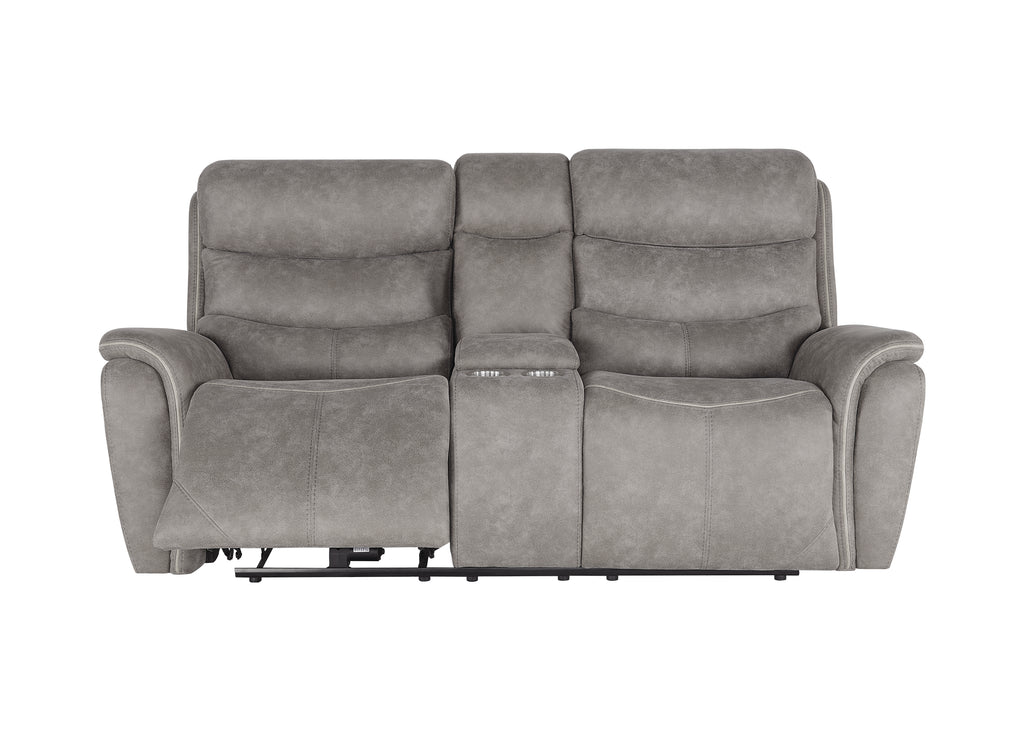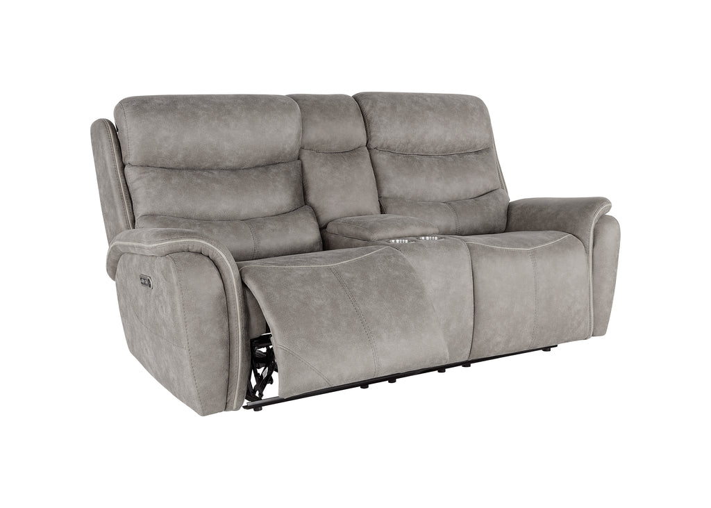 Experience the epitome of luxury and relaxation with the Kamari Reclining Console Loveseat with Power Headrests and Footrests in Gray. Crafted from a blend of polyester and PU fabric, its suede-like upholstery offers sumptuous softness and easy maintenance. Tailored with triple roll backs and wrap-around arms, this loveseat exudes sophistication, complemented by tasteful contrasting welt detailing. Indulge in ultimate comfort with fully upholstered chaise recliner footrests and adjustable headrests, effortlessly positioned to your preference with the touch of a button. Supported by sturdy hardwood and manufactured wood frames, coil spring cushions, and resilient foam, this loveseat ensures enduring comfort and support. Charge your devices conveniently with built-in USB chargers, while storing remote controls in the handy center console and keeping beverages close by in the built-in cupholders. Whether your style is contemporary or traditional, this versatile loveseat seamlessly complements any decor, promising years of enjoyment and timeless elegance.