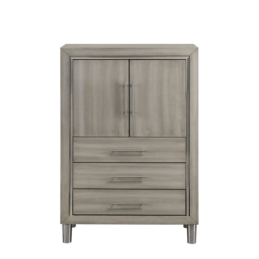 • Lustrous Details: The furniture features a specialty metallic finish over wood that mimics the modern, polished look of stainless steel while offering exceptional durability and scratch resistance. It enhances the light gray finish, adding a sleek, sophisticated touch ideal for a contemporary ambiance.