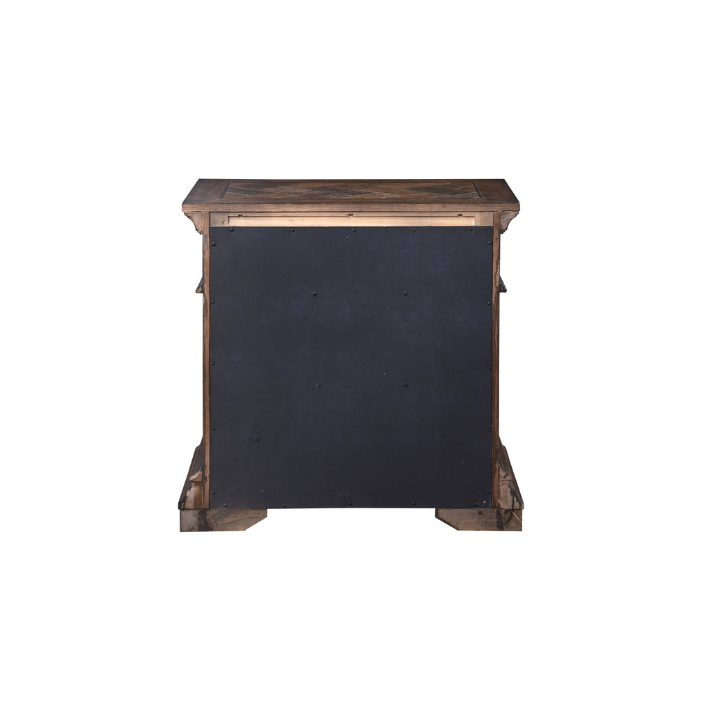 Discover the Mar Vista Nightstand, a testament to craftsmanship and timeless design. Constructed with solid Rubberwood and Oak veneers, this nightstand promises enduring strength and stability. Its rich walnut finish, achieved through meticulous distressing, wire brushing, and charcoal glazing, accentuates the wood’s inherent beauty. The nightstand’s traditional style is expressed through prominent crown moldings, carved bracket feet, and convex pilaster moldings, all complementing the distinctive herringbone wood inlays that define the Mar Vista Collection. Beyond its external elegance, the nightstand offers quality internal features, including drawers built with English dovetail joinery, full extension drawer glides, and polished drawer interiors. The three spacious drawers provide ample storage for bedside necessities, with a felt-lined top drawer to protect watches, glasses, and other sensitive items. Experience the blend of functionality and aesthetic appeal with the Mar Vista Nightstand.