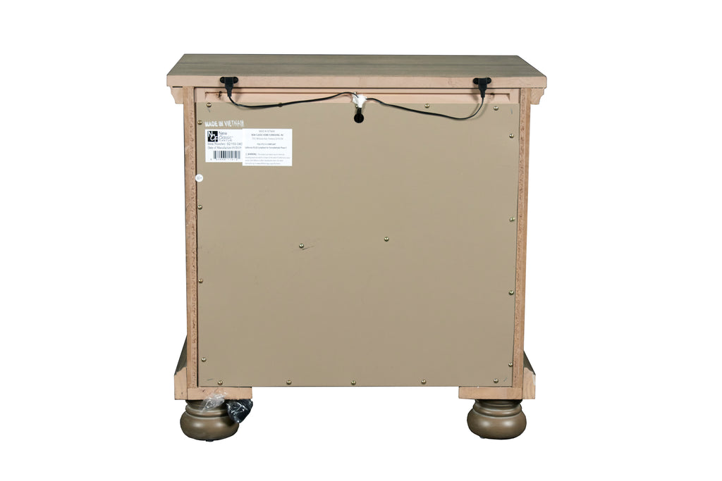 The Allegra 3 Drawer Nightstand in a refined pale pewter finish offers the perfect blend of durability, style, and modern convenience. Expertly crafted from solid Mindi wood, engineered woods, and wood veneers, this nightstand showcases the natural beauty of Mindi's rich grain while providing exceptional durability and resistance to decay. The meticulous multi-step finish, enhanced by a delicate brush treatment and subtle white hang-up effect, adds depth and character to the piece, making it a timeless addition to any bedroom. The transitional design seamlessly fits both traditional and contemporary interiors, with clean lines and subtle curves that add a touch of modern sophistication. Built with heirloom craftsmanship, the drawer construction features four-corner English dovetail joints for strength and durability, along with smooth-rolling full-extension glides for easy access. The fully finished interiors protect your belongings, while the thoughtfully designed hidden storage drawer offers an extra layer of security for your valuables. For added functionality, the nightstand includes convenient USB charging ports mounted on the back, ensuring your devices stay powered up and within reach. The Allegra 3 Drawer Nightstand is an excellent choice for those seeking a stylish, durable, and practical bedside solution.