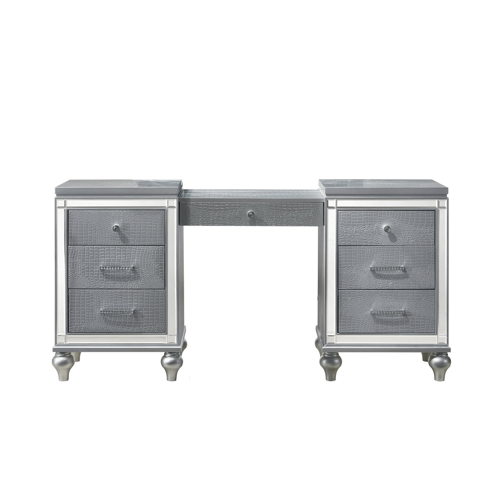 Introducing the Valentino 7 Drawer Vanity Dressing Table in sleek Silver—a masterpiece of enduring craftsmanship crafted from a blend of manufactured and solid woods, adorned with exquisite embossed inlays. Revel in its glitz and glam, featuring a gleaming Silver finish, mirrored trims, crystal-studded drawer pulls, and alligator-embossed accents that exude Hollywood allure. Delight in its thoughtful details, from heirloom-crafted English dovetailed drawers with snag-free interiors to smooth full-extension ball-bearing glides. With an abundance of storage, this vanity table offers ample space to organize cosmetics and accessories, including a luxurious velvet-lined drawer for jewelry. Transform your beauty routine into a glamorous experience with this exquisite piece—a true reflection of style and functionality.