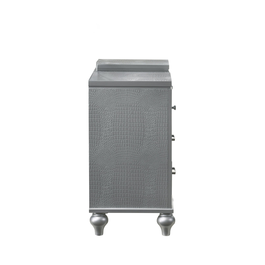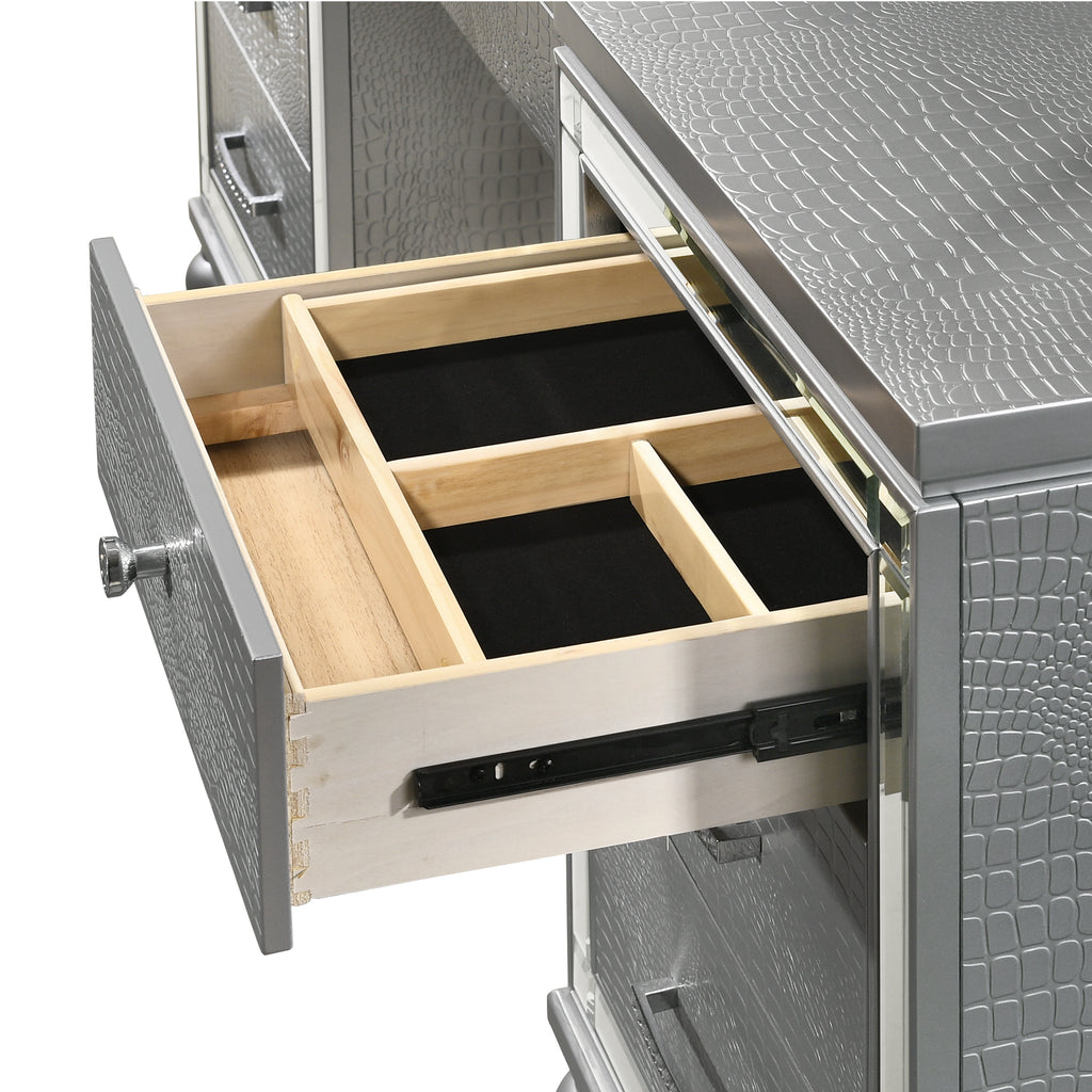 • Glitz and Glam Details: Gleaming Silver finish, mirrored trims, crystal studded drawer pulls and alligator embossed inlays evoke a Hollywood glam appeal.