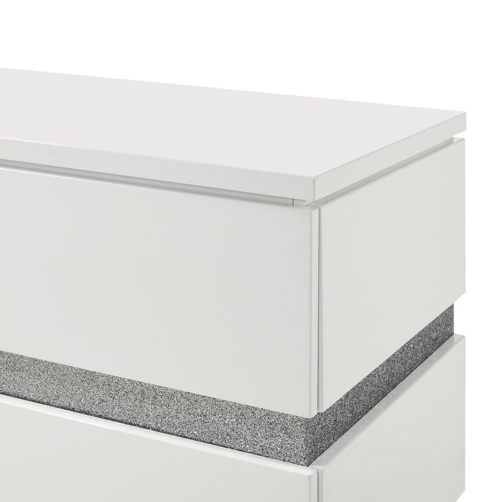 The Paradox Six Drawer Dresser in White combines contemporary appeal with robust functionality. Its gleaming white gloss laminate finish offers a sleek, modern look while providing the practical benefits of scratch and water resistance. Crafted from a combination of solid and manufactured woods, this dresser ensures long-lasting durability. The fully finished drawers offer snag-free storage and glide effortlessly on full-extension, ball-bearing drawer glides. The show-stopping design, featuring a modern white finish and glittering silver mylar inlays, transforms your bedroom into a high-style retreat. With six spacious drawers, this dresser provides ample storage space for all your clothing, making it an essential and stylish addition to any bedroom.